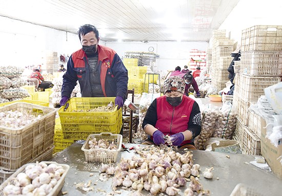 2월 23일,진안구 루방진(楼房镇) 마가촌(马家村)의 한 농산물재벌가공공장에서 촌민들이 마늘을 가공하고있다.