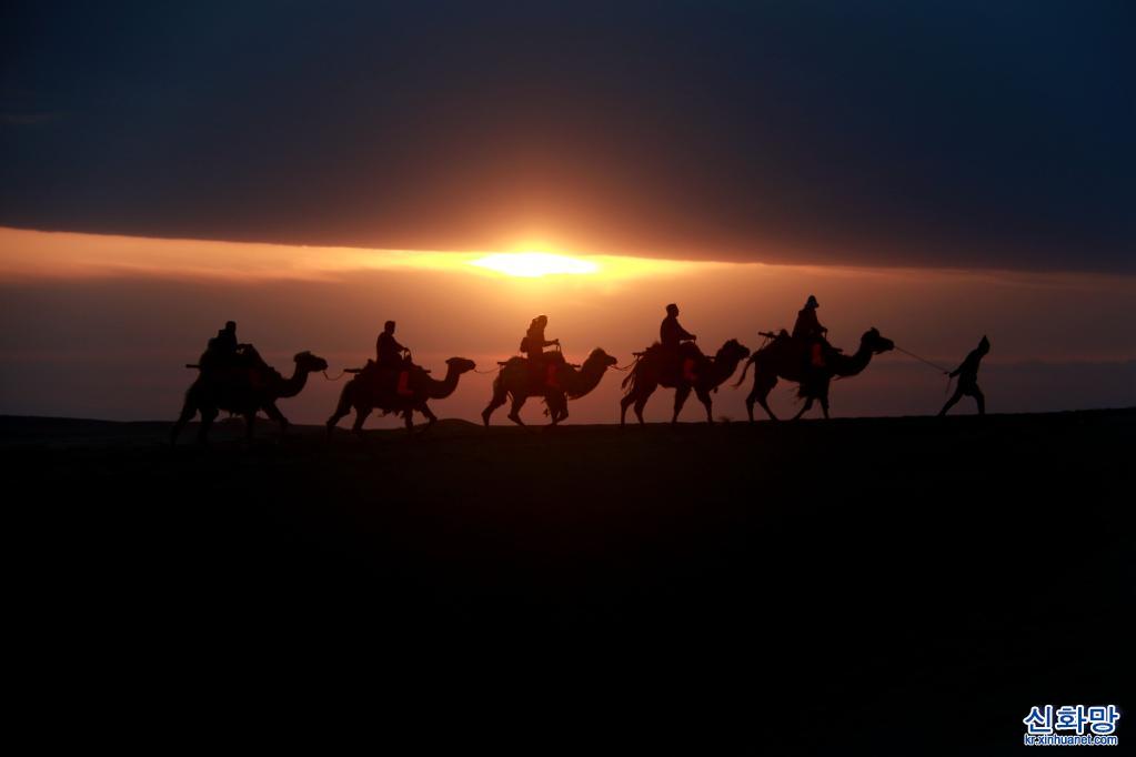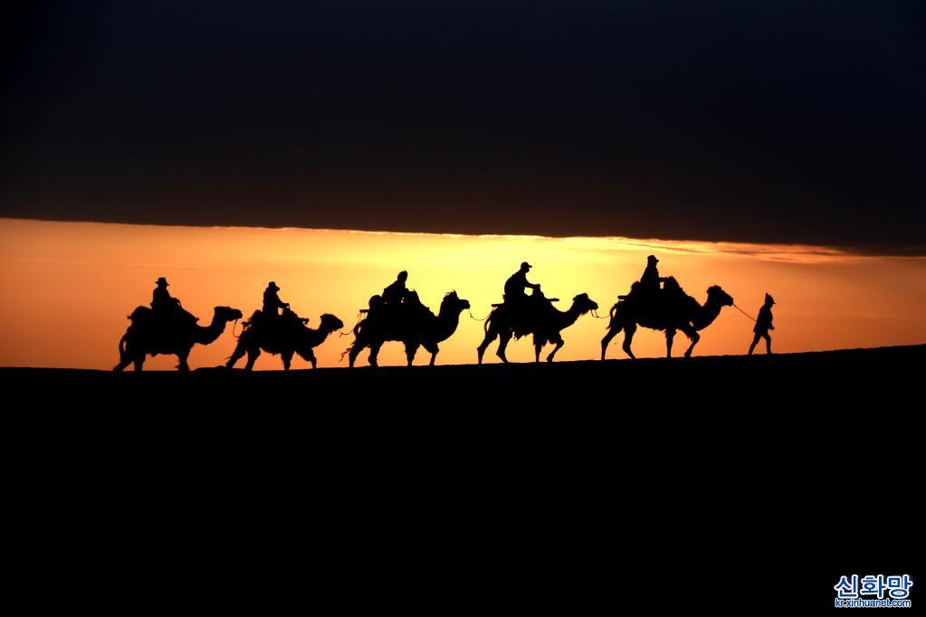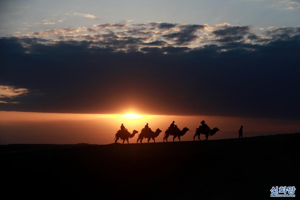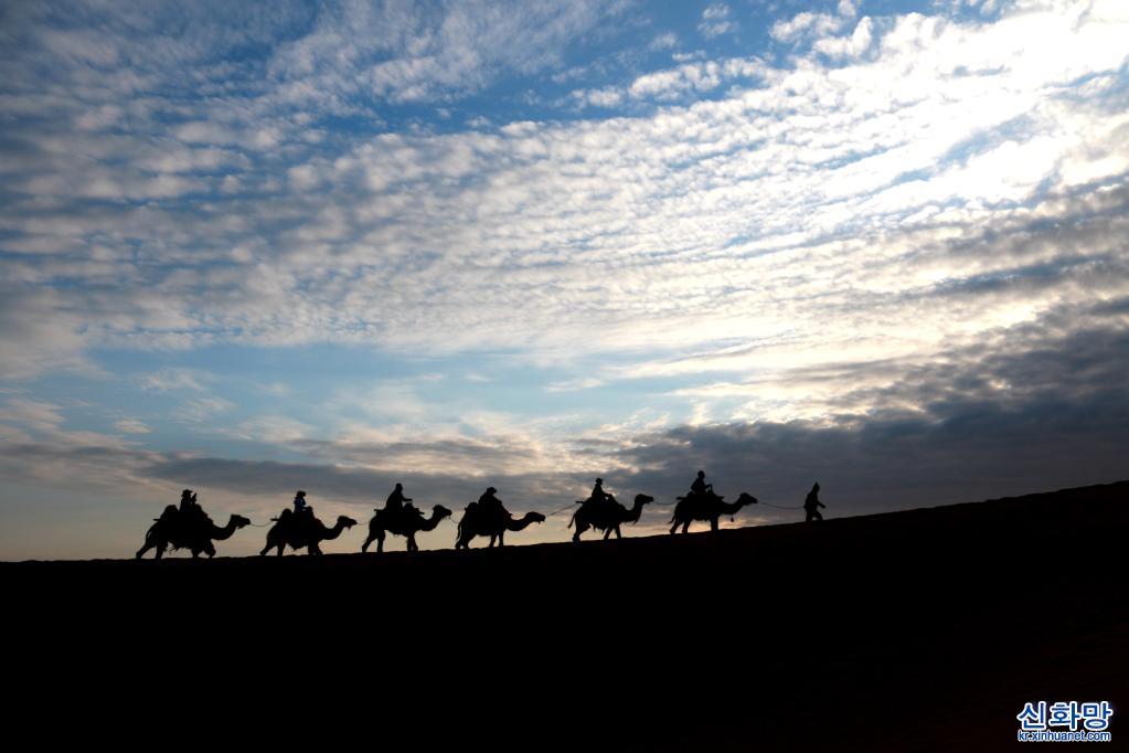 15일 간쑤성 둔황(敦煌)시 밍사(鳴沙)산 웨야(月牙)천 관광지에서 관광객들이 낙타를 타고 투어를 하고 있다. 아침 햇살 아래 구름과 모래산, 낙타와 투어객들이 어우러져 한 폭의 그림 같은 환상적인 풍경을 자아냈다.[촬영/장샤오량(張曉亮)]