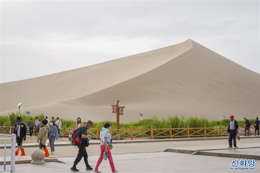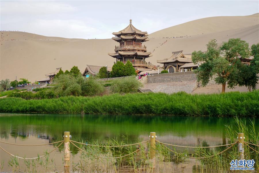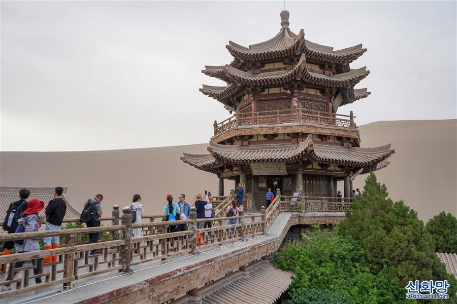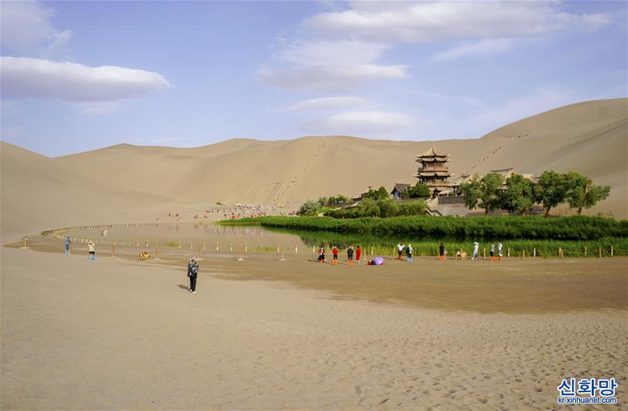 5월30일, 유람객이 웨야취안(月牙泉) 호숫가에서 유람하며 기념촬영을 하고 있다. 간쑤(甘肅)성 둔황(敦煌)시에 자리한 푸른 물결이 일렁이는 웨야취안이 요즘 많은 유람객의 발길을 끌었다. [촬영/ 신화사 기자 랑빙빙(郎兵兵)]