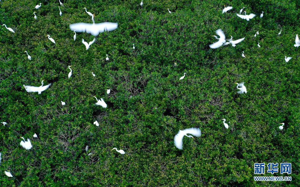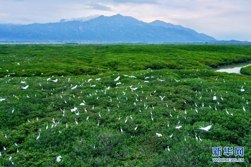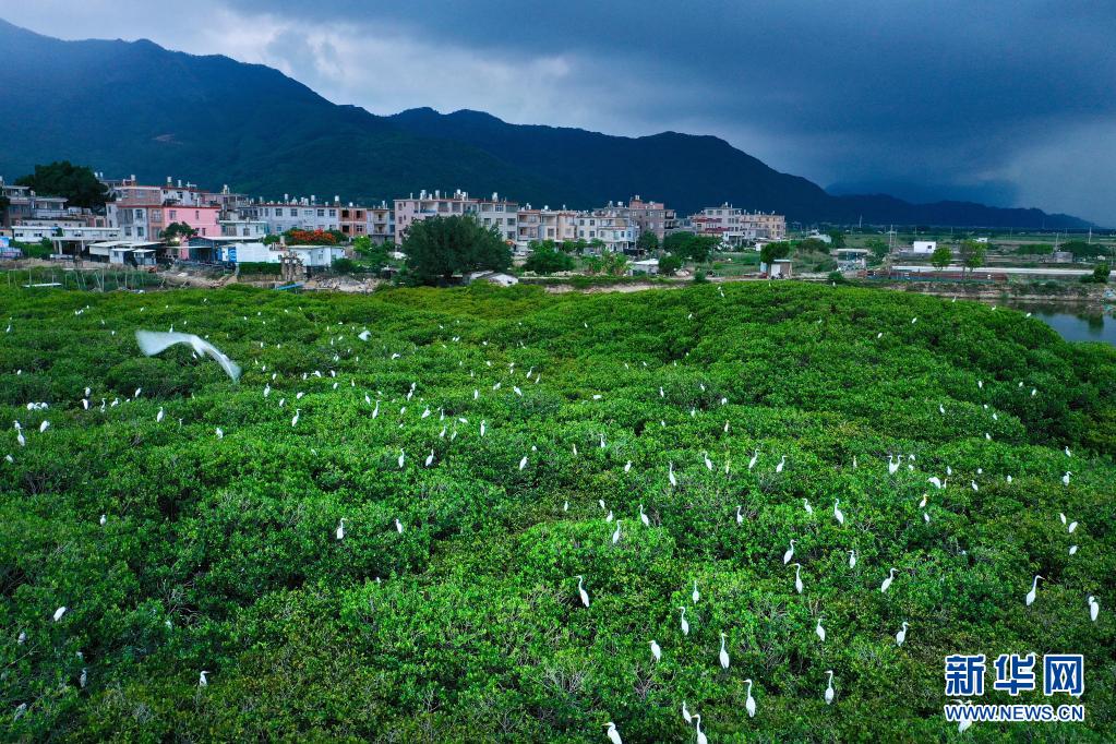 장장커우(漳江口) 맹그로브림 국가급 자연보호구에서 서식하는 백로와 인근 마을이 어우러져 자연과 인간이 조화롭게 공존하는 풍경을 연출하고 있다.