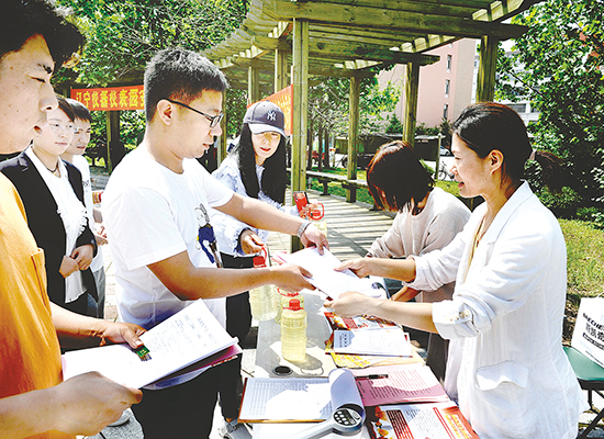 사진은 현장에 부스를 설치하고 회의에 참가한 기업대표, 군중들에게 안전생산 선전 전단과 알콜소독용품을 배포하는 장면이다. 기자 송영곤 찍음