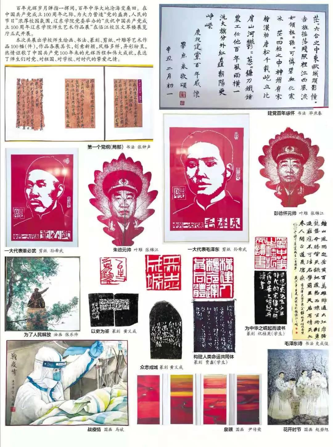 이번 행사에 학교의 교사와 학생들의 회화, 서예, 전각, 전지, 잎조각 등 예술작품 100점이 전시되었다. 작품들은 창의성이 있고 다양하고 이채로운 풍격을 통해 중국공산당 100년래의 빛나는 로정과 위대한 성과를 열정적으로 구가하였고 교사와 학생들의 당과 조국에 대한 진지한 감정을 표달했다.