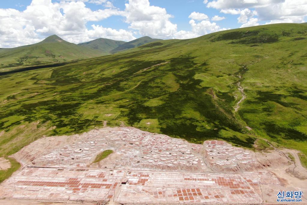 22일 칭하(青海)성 위수(玉樹) 짱족자치주 낭첸(囊謙)현 바이자(白扎)향에서 드론으로 촬영한 바이자 염전 풍경.