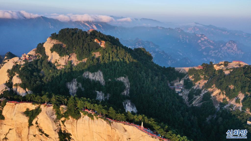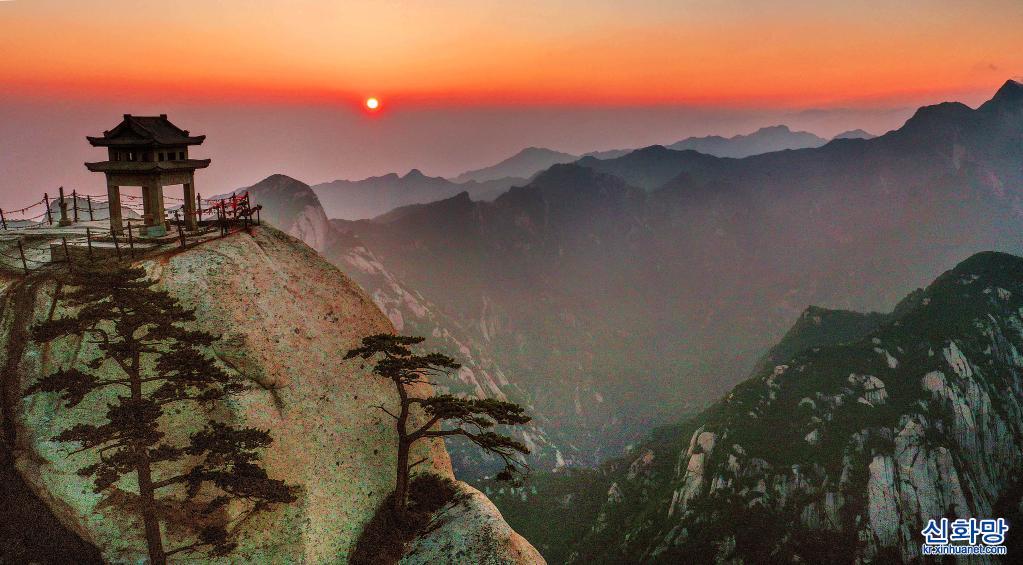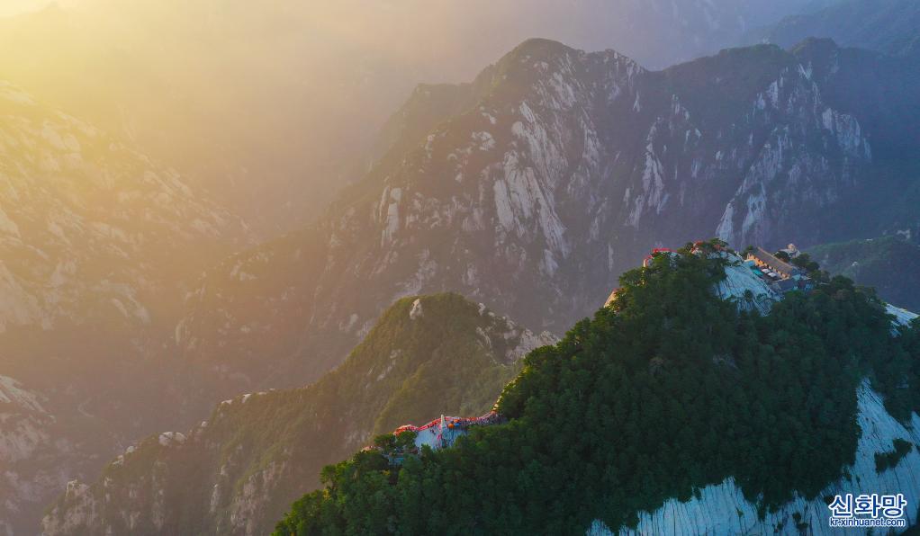 15일 화산 동쪽 봉우리에서 드론으로 촬영한 일출. 산시(陝西)성 웨이난(渭南)시에 위치한 화산에 장엄한 해돋이 장관이 펼쳐지고 있다. [촬영/신화사 기자 타오밍(陶明)]