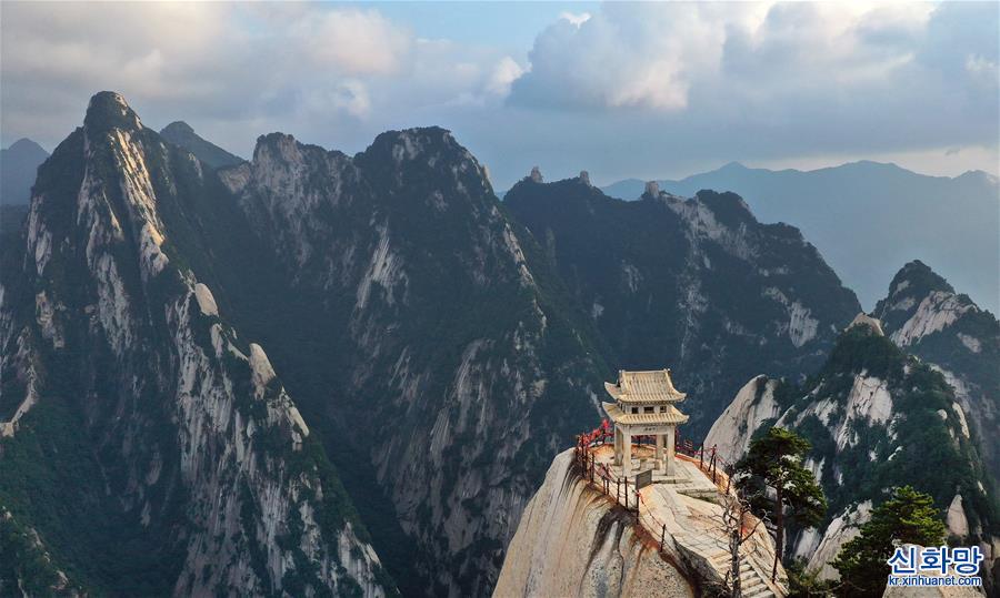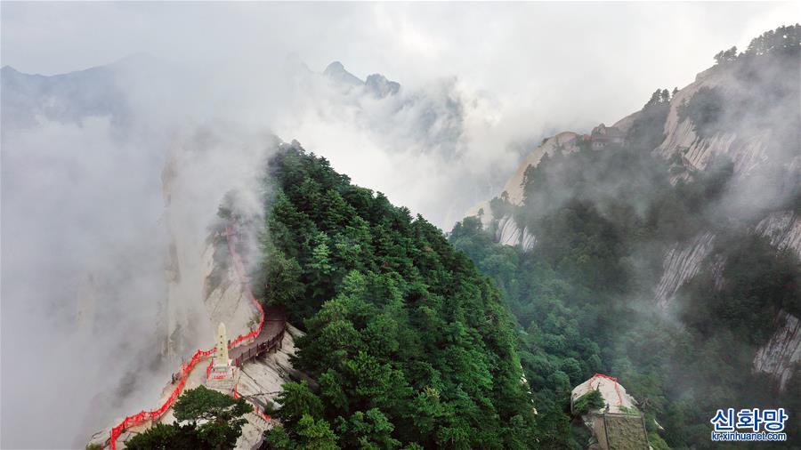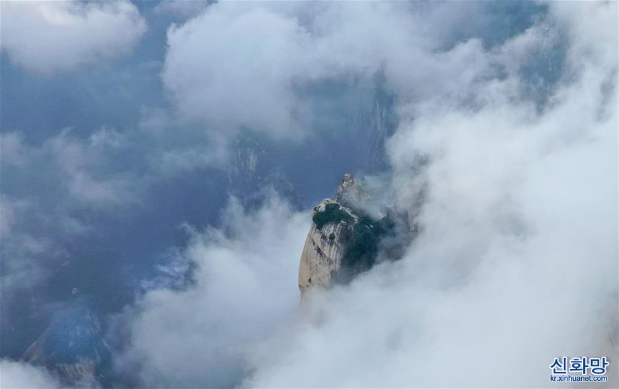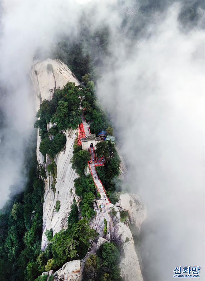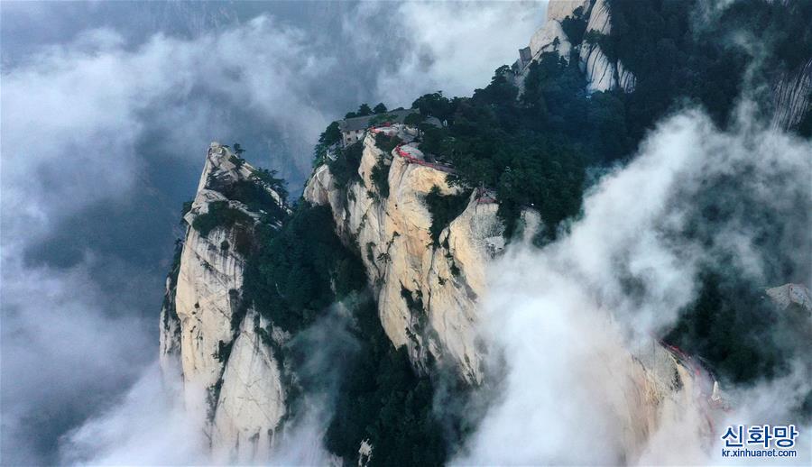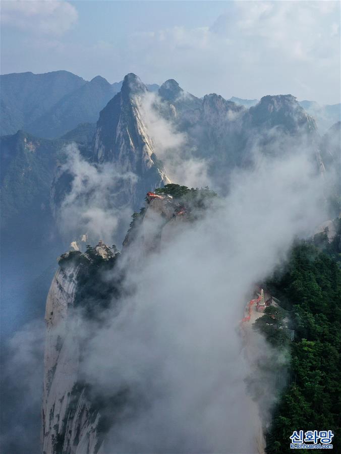 서악 화산의 몽환적인 풍경(8월14일, 드론 사진) 운무에 뒤덮인 화산(華山)이 몽환적인 초가을 풍경을 연출하고 있다. 중국 오악 중 서악으로 불리는 화산은 산시(陝西)성 웨이난(渭南)시에 위치해 있으며, 5대 명산 중 산세가 가장 험준한 산으로 꼽힌다. [촬영/신화사 기자 타오밍(陶明)]