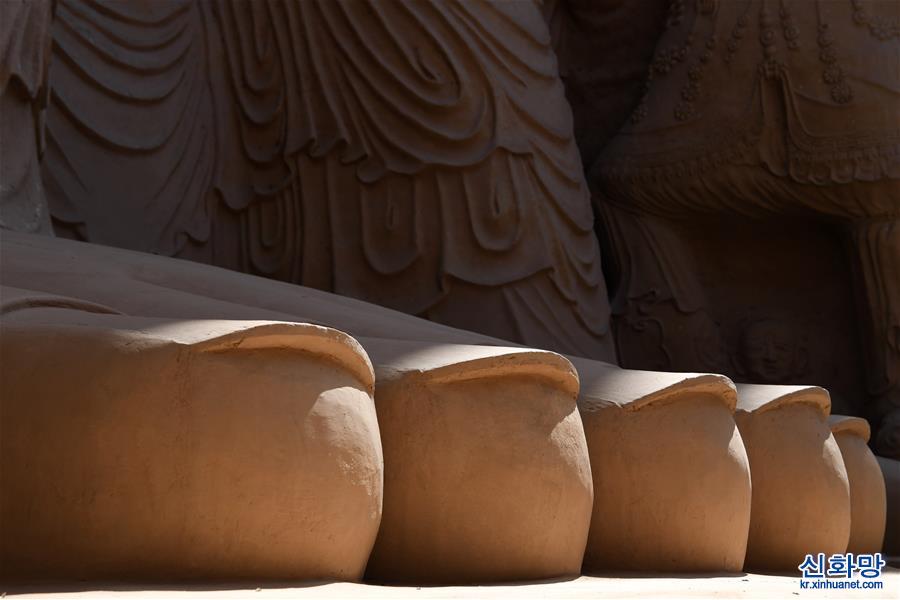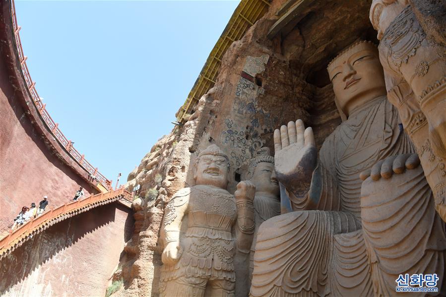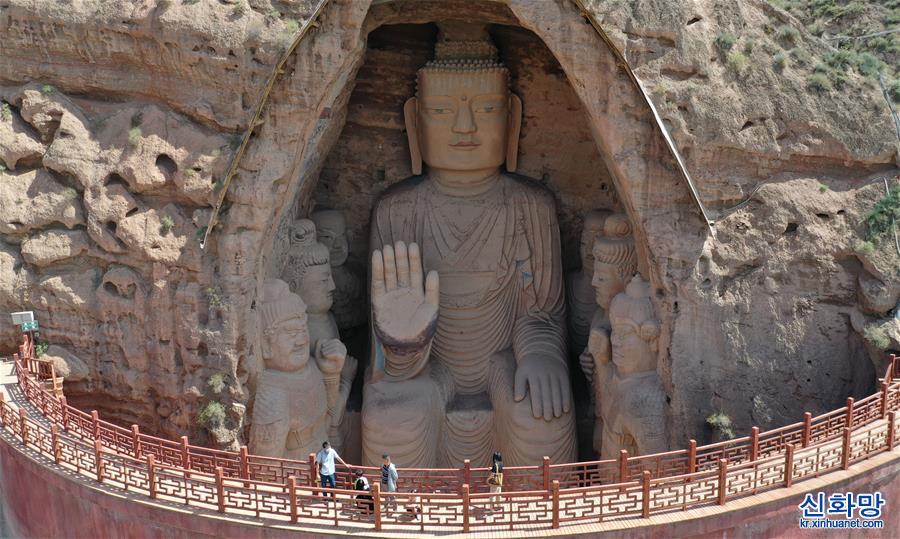 복원을 마친 톈티산 석굴 제13호굴 대불(8월20일 촬영) 1년여의 보호와 복원 끝에 간쑤성 우웨이(武威)시에 있는 톈티산(天梯山) 석굴 제13호굴 대불의 발 부분과 일부 위험한 암석의 응급조치성 보수 작업이 거의 마무리됐다. 문물 주무부처의 동의를 받아 이루어진 이번 응급조치성 보수 공사는 둔황연구원 등이 주도했으며 빗물과 침식으로 인해 무너진 대불의 발 부분 및 피해가 심각한 암석 두 곳을 주로 보수했다. 텐티산 석굴 13호굴 대불은 전반적으로 복원됐다. 톈티산은 치례산(祁連山) 동쪽에서 뻗어 나온 지맥이다. 동진 16국 시대의 북량 때 조성된 암벽 위의 석굴은 지금으로부터 약1600년의 역사를 가지고 있으며 중국 초기 석굴 예술의 대표적인 석굴로 꼽힌다.[촬영/신화사 기자 천빈(陳斌)]