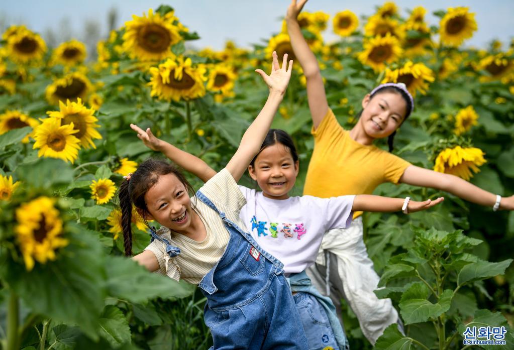 4일 어린이들이 활짝 핀 해바라기꽃을 배경으로 포즈를 취하고 있다.