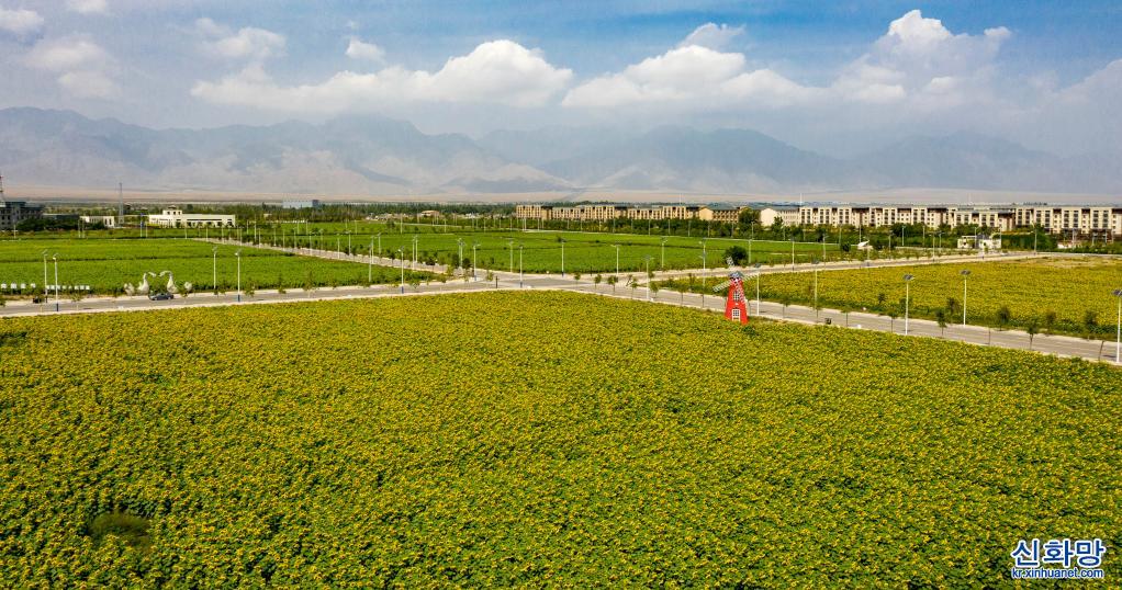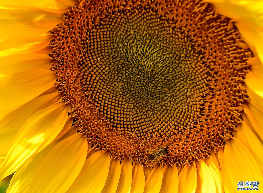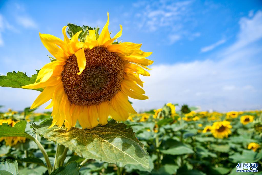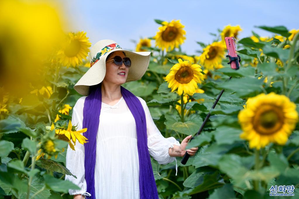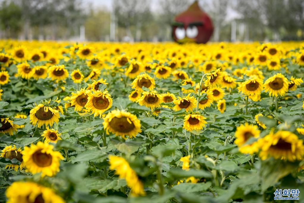 성큼 다가온 가을 날씨 속에 허란산 아래의 닝샤후이족자치구 인촨(銀川)시 시샤(西夏)구 전베이푸(鎮北堡)진을 찾은 관광객들이 활짝 핀 해바라기꽃을 감상하고 있다. 지난해부터 관상용 뿐만 아니라 경제적 가치도 높은 해바라기를 재배하기 시작한 전베이푸진 더린(德林)촌은 ‘해바라기 바다’ 경관을 조성해 농촌 명소로 새롭게 떠오르고 있다.[촬영/신화사 기자 펑카이화(馮開花)]