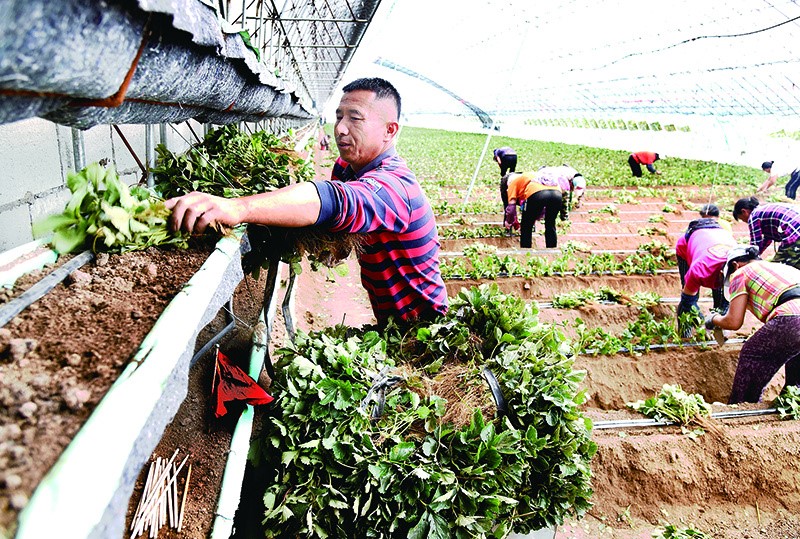 8월 31일, 진안구 루방진 마가촌(楼房镇马家村)딸기 비닐하우스 50여동에서 농가들이 딸기 모종을 골라 재배하고 있다.