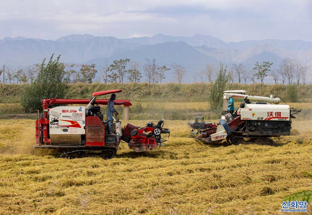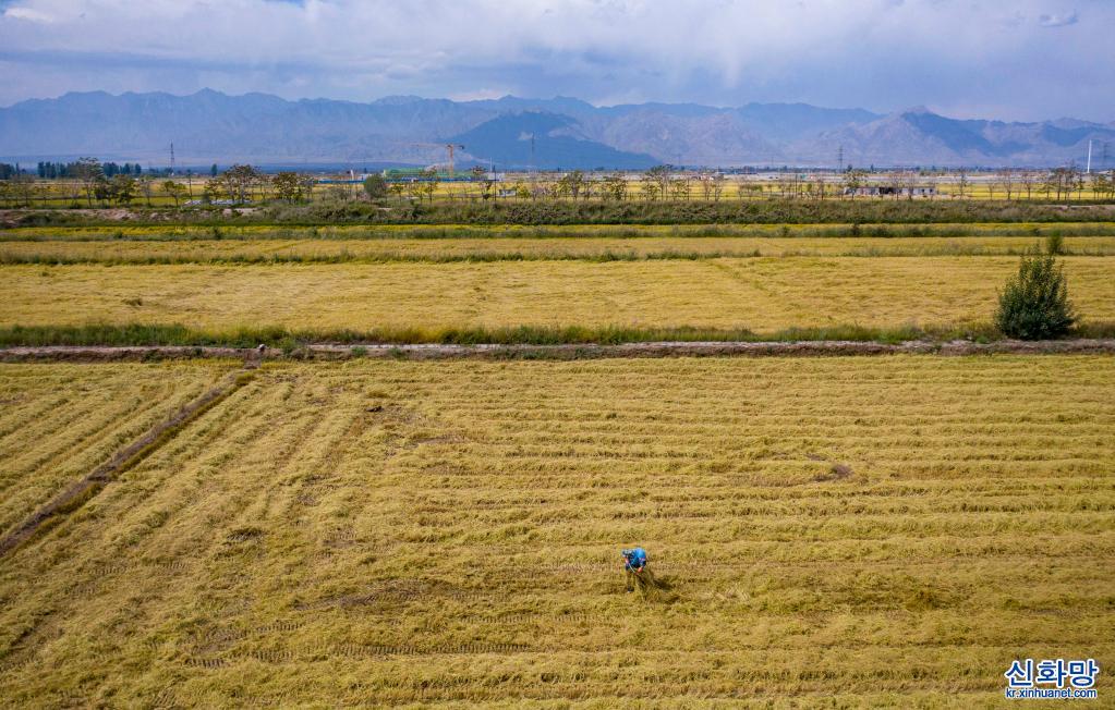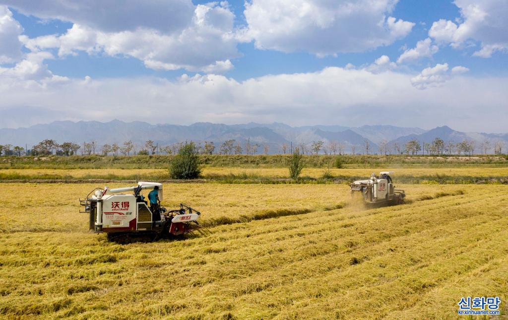 어느새 황금빛으로 변한 닝샤 허란산(賀蘭山) 아래의 들판에서는 벼 수확이 한창이다. [촬영/신화사 기자 양즈썬(楊植森)]