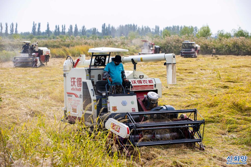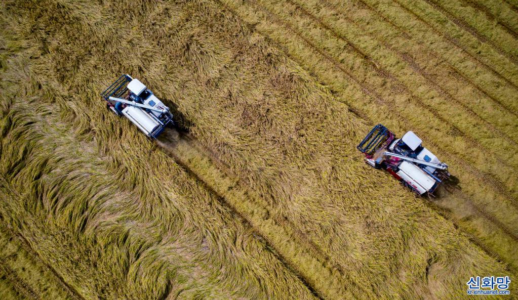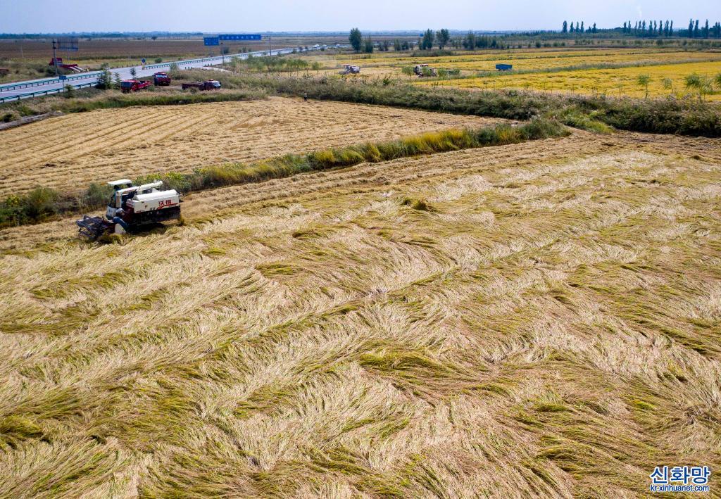 20일 닝샤후이족자치구 스주이산(石嘴山)시 핑뤄(平羅)현의 한 농장에서 농민이 콤바인으로 벼를 수확하고 있다.(드론 사진)