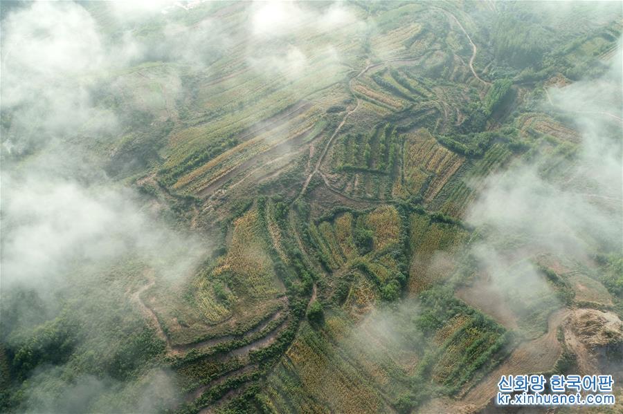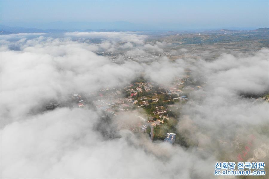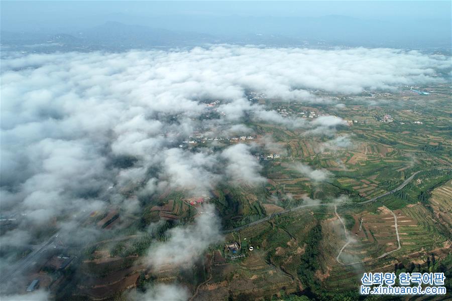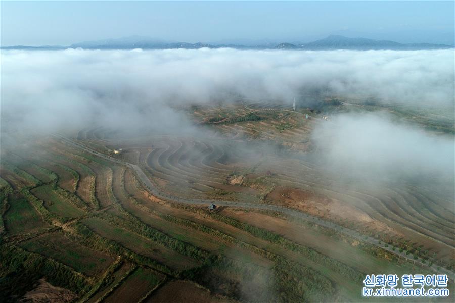 허베이성 린청(臨城)현 운해 경관(10월 7일 드론 촬영) 비가 내린 후 맑게 갠 타이항산 지역의 허베이성 싱타이(邢臺)시 린청현에 운해 풍광이 연출됐다. 자욱한 운해 속에서 산과 다랭이논, 도로가 보일 듯 말 듯 장관을 이뤘다. [촬영/신화사 기자 머우위(牟宇)]