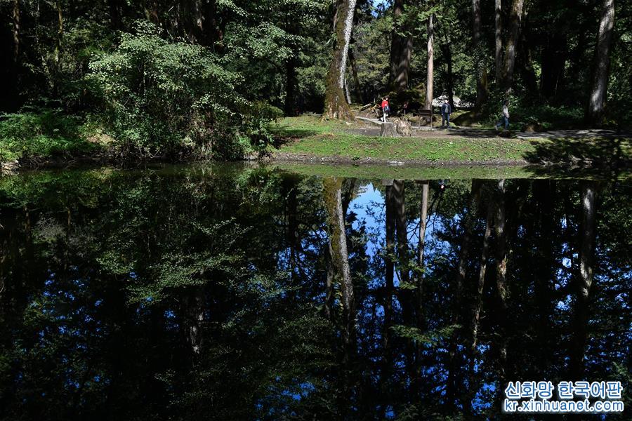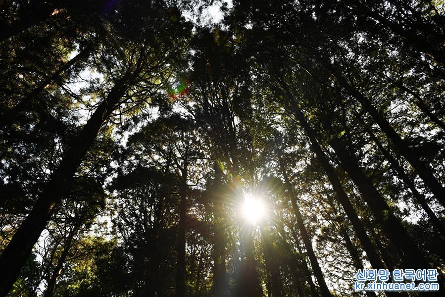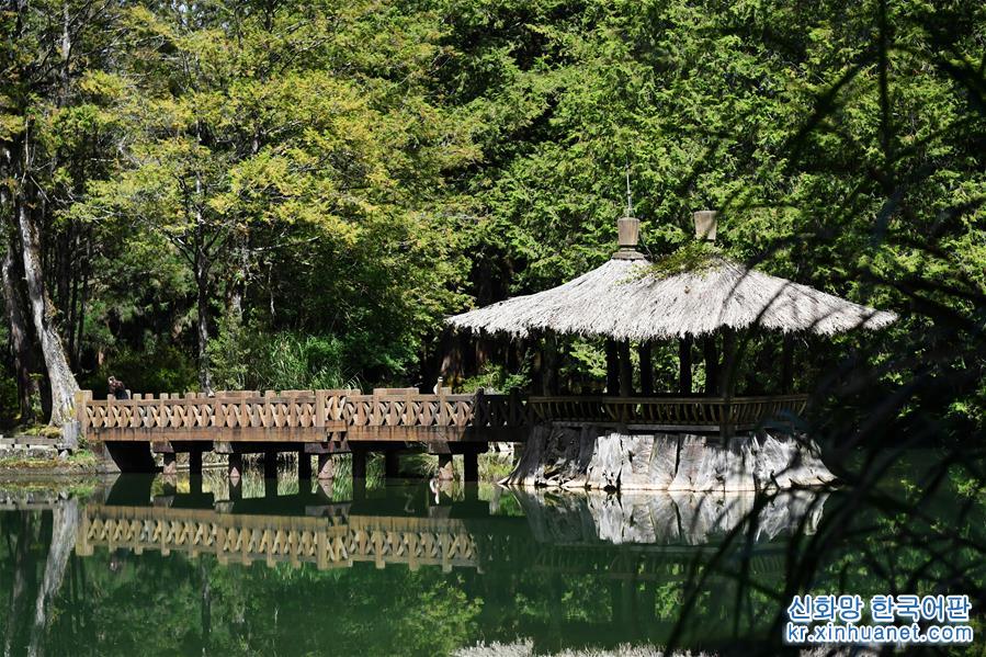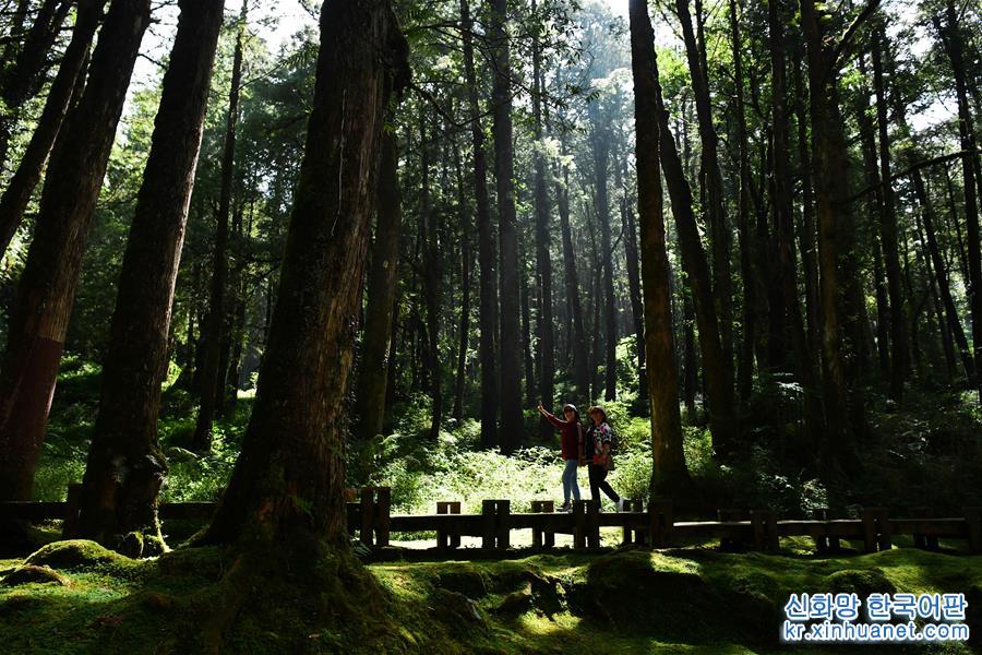 10월7일, 관광객이 아리산의 숲 속에서 유람을 하고 있다. 완연한 가을로 접어들면서 타이완 중남부에 있는 아리산은 매혹적인 한 폭의 가을 풍경화를 그려 놓은 듯 하다. [촬영/신화사 기자 천빈(陳斌)]