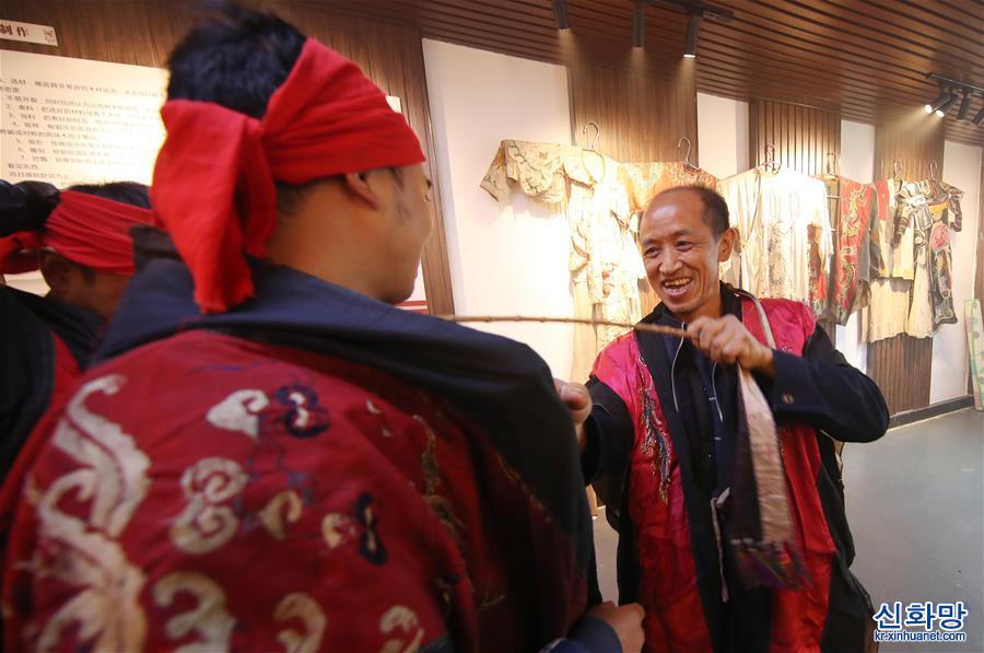 17일 샤오광화(肖光華∙왼쪽)가 제자들에게 중국 전통 민속 희극 ‘나희(儺戱)’ 공연을 지도하고 있다.