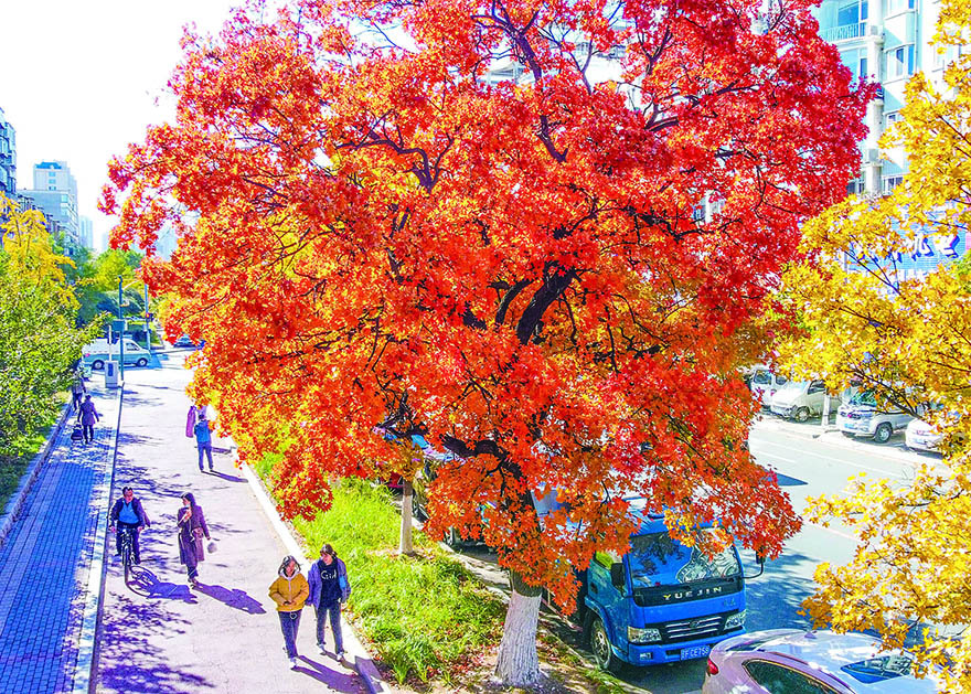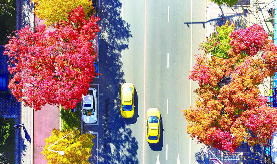 10월 27일, 마가을에 들어선 단동시구역 진팔거리(振八街)는 단풍으로 물들어 적색, 귤색, 노란색이 어우러진 아름다운 풍경을 연출했다.