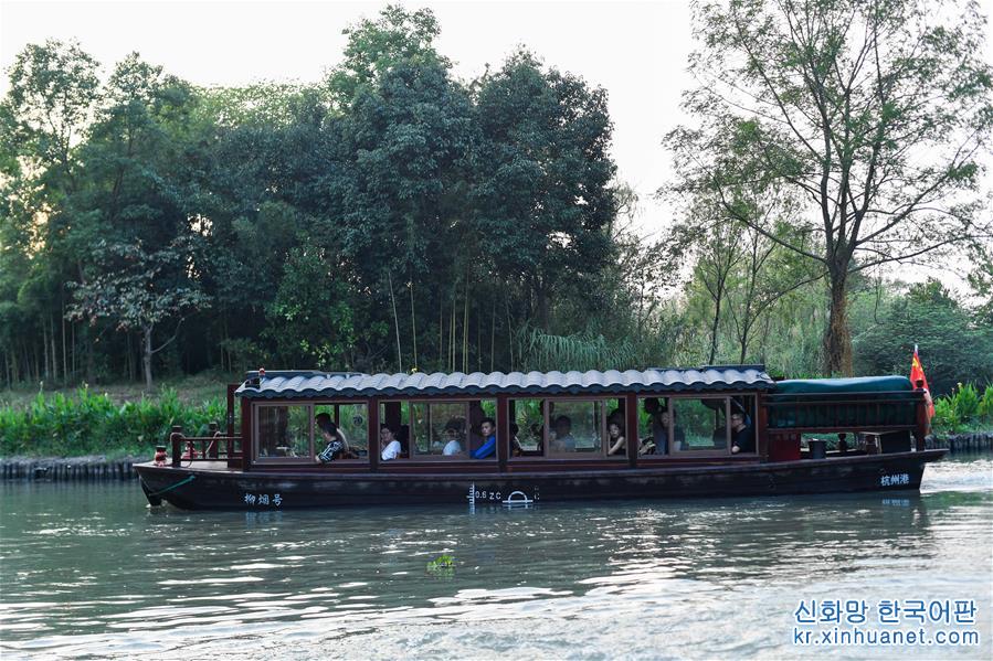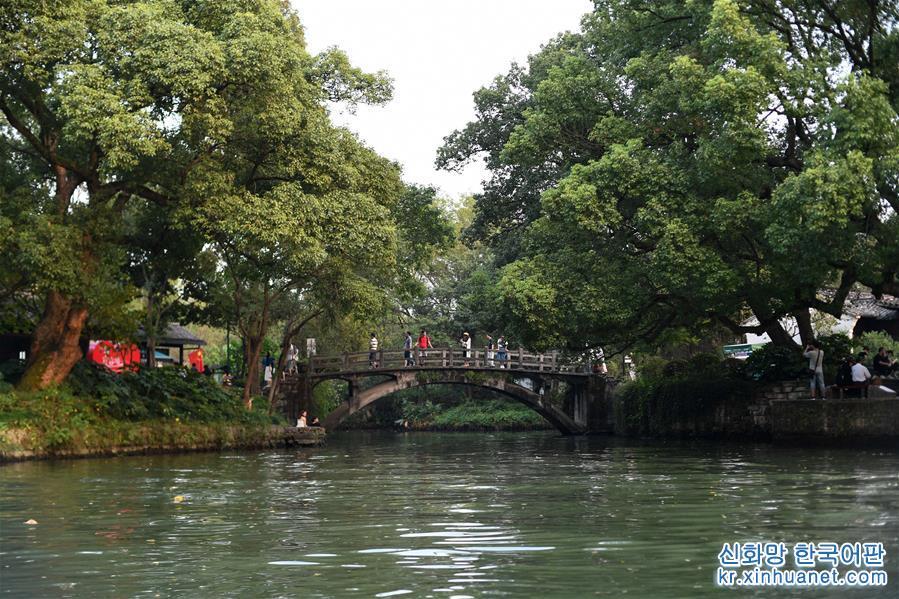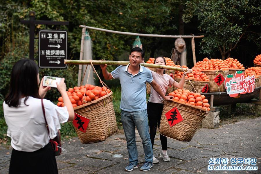10월3일, 관광객이 시시 국가습지공원의 ‘감 벽’ 앞에서 기념사진을 찍고 있다. 시시(西溪) 습지 내 감나무 7000여 그루가 풍성한 수확의 계절을 맞았다. 국경절 사흘째인 3일 많은 관광객들이 항저우에 있는 시시 국가습지공원을 찾아 강남의 시적 운치가 가득한 곳에서 연휴를 즐겼다. [촬영/신화사 기자 황쭝즈(黃宗治)]