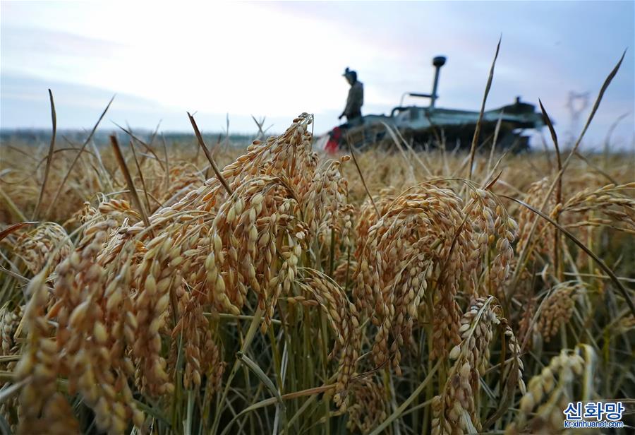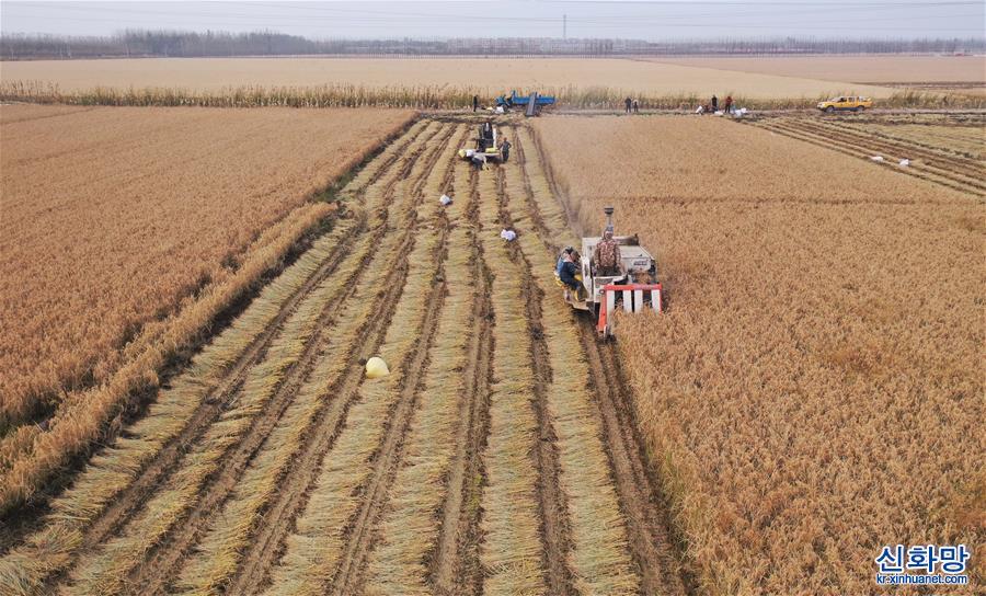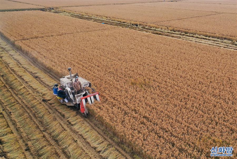29일 탕산시 차오페이뎬구 제8농장의 한 농업 업체의 직원이 기계로 벼를 수확할 준비를 하고 있다. 중국 허베이(河北)성 탕산(唐三)시 차오페이뎬(曹妃甸)구에서 벼 수확이 시작됐다. 올해 차오페이뎬구의 벼 수확 면적은 32만 묘에 달할 것으로 예상된다.[촬영/신화사 기자 양스야오(楊世堯)]