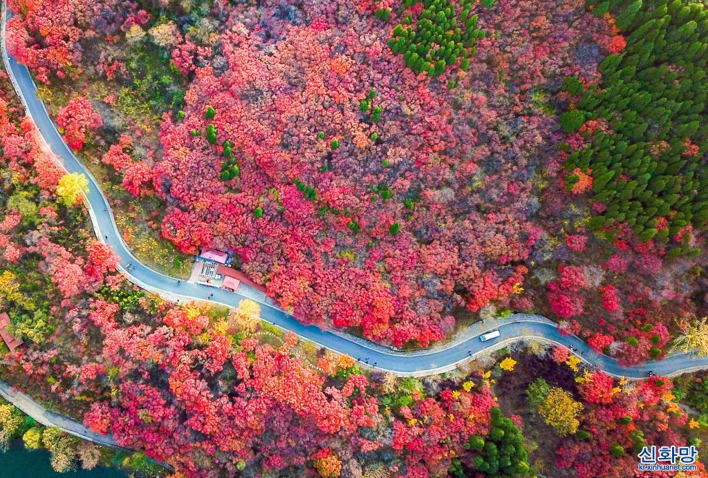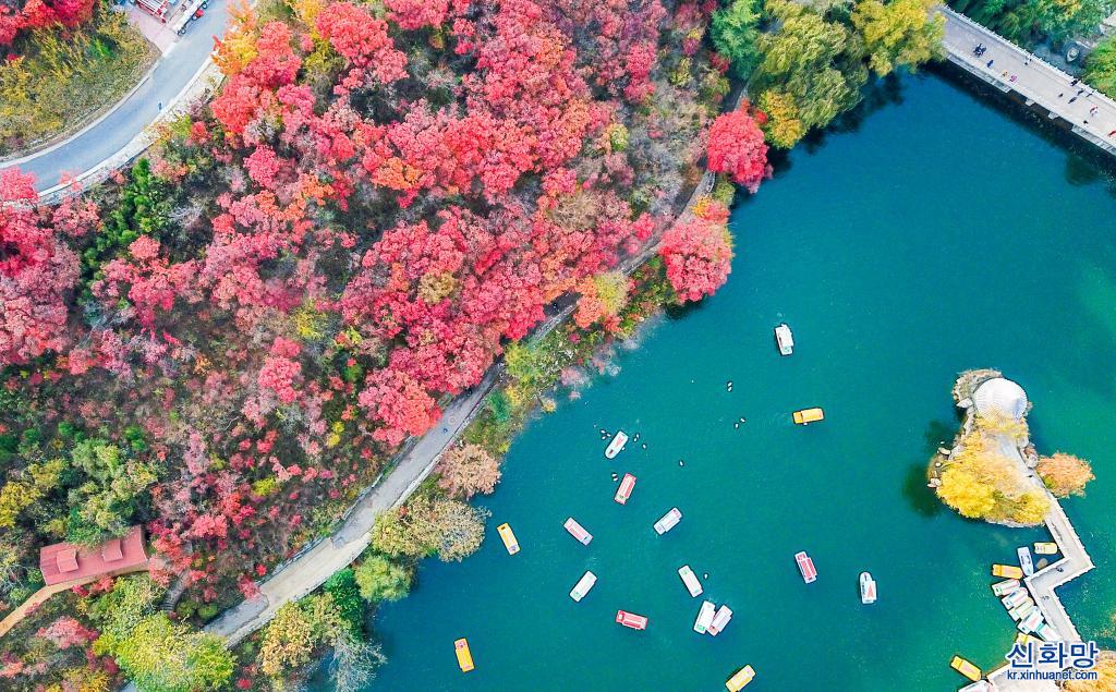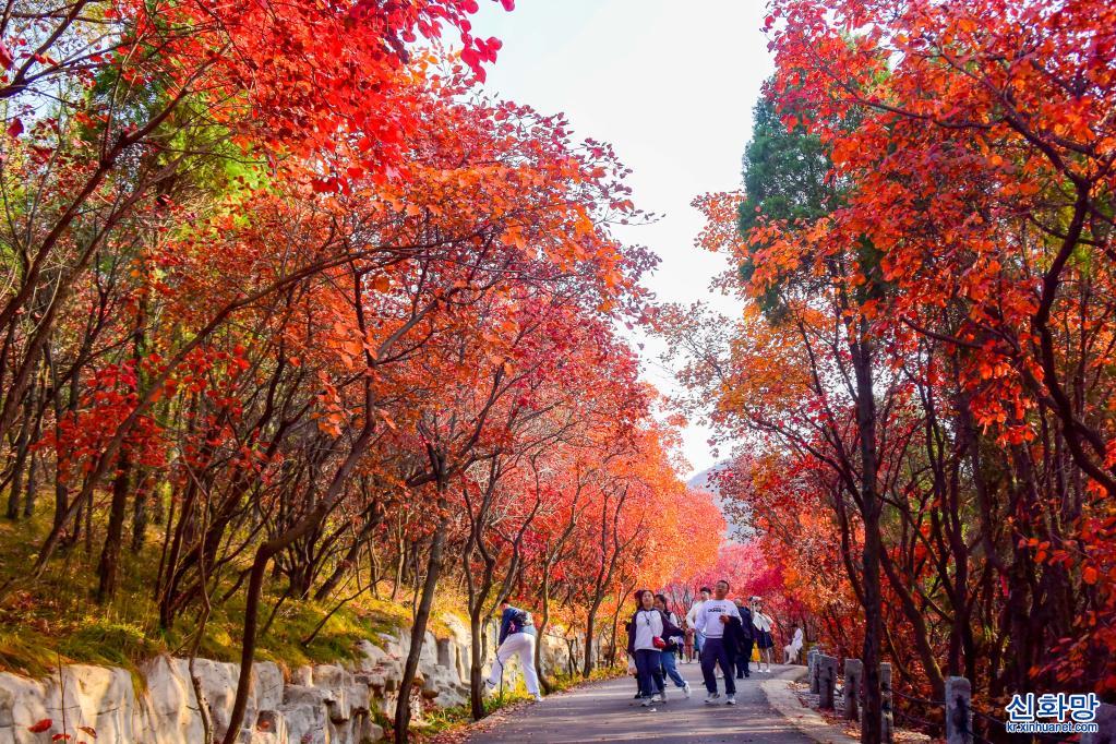 111 지난시 단풍계곡에서 나들이객들이 단풍을 즐기고 있다. 산둥(山東) 지난(濟南) 남부 산간구역 단풍계곡에 울긋불긋 가을빛이 곱게 내려앉았다. [촬영/신화사 기자 주정(朱崢)]
