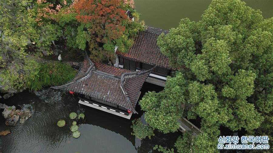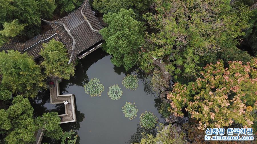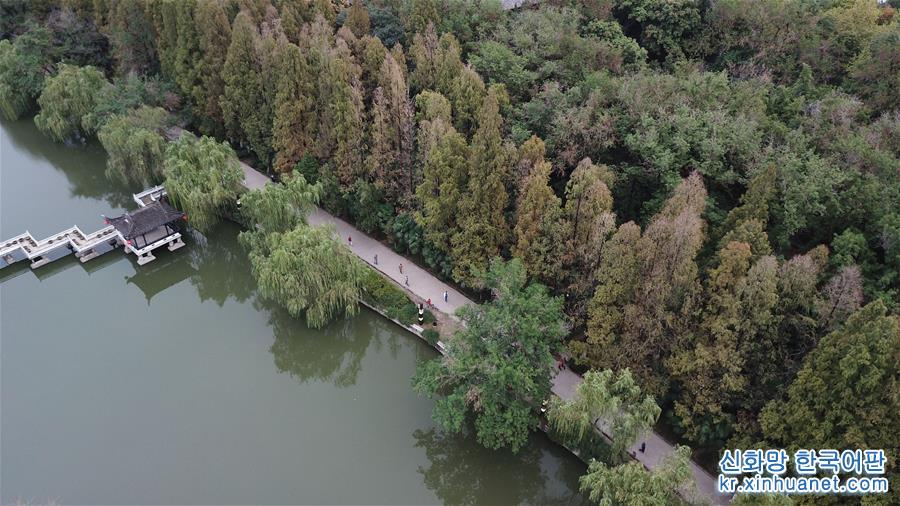 10월 6일, 여행객이 바오(包) 공원에서 노닐고 있다. (드론 촬영) 안후이 허페이(合肥)에 있는 바오 공원이 수려한 가을빛 풍광으로 물들었다. [촬영/신화사 기자 장돤(張端)]