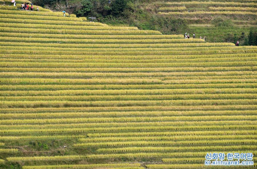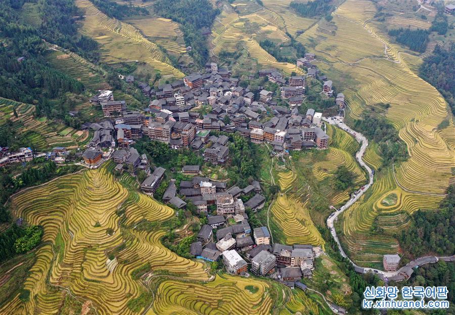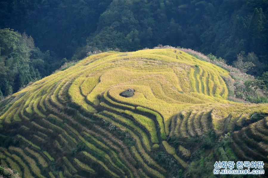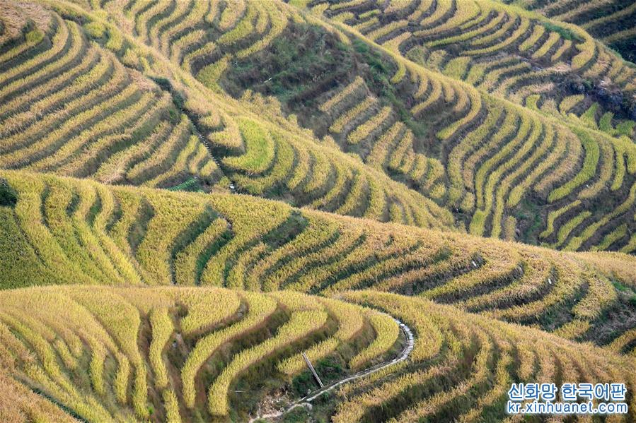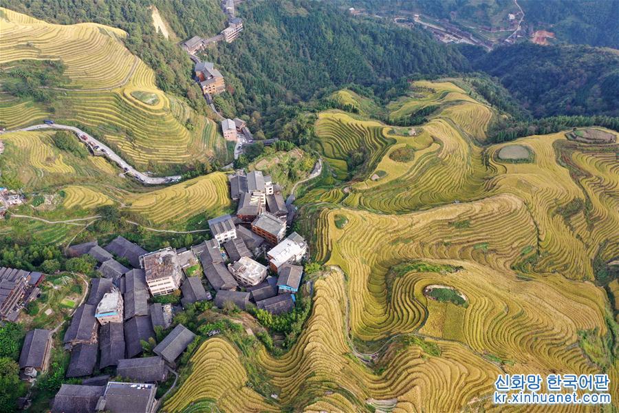 10월 10일 드론으로 촬영한 광시(廣西) 룽성각족(龍勝各族)자치현 룽지(龍脊) 다락논. 수확철 한창인 광시 룽성각족자치현 룽지 다락논이 햇볕 아래 한폭의 그림처럼 아름다운 경치를 사람들 눈앞에 펼쳐주었다. [촬영/ 신화사 기자 루보안(陸波岸)]