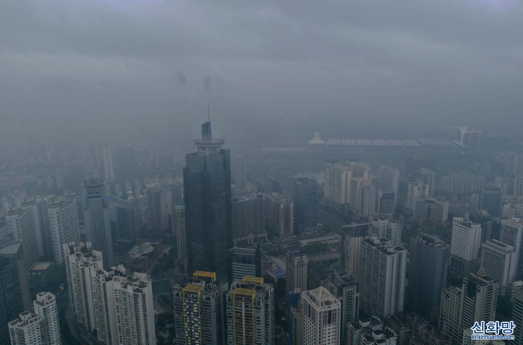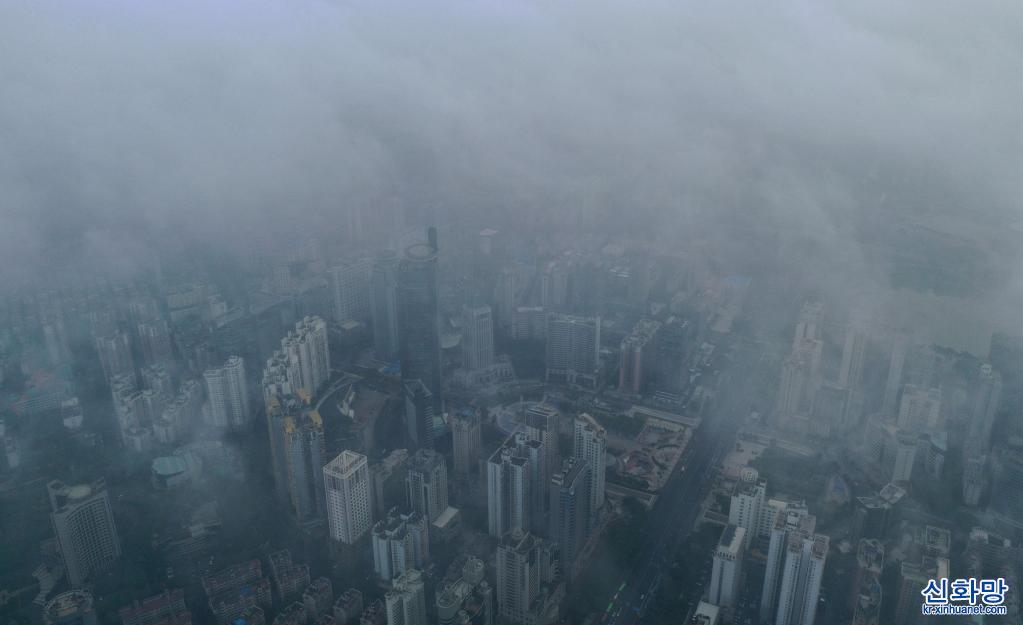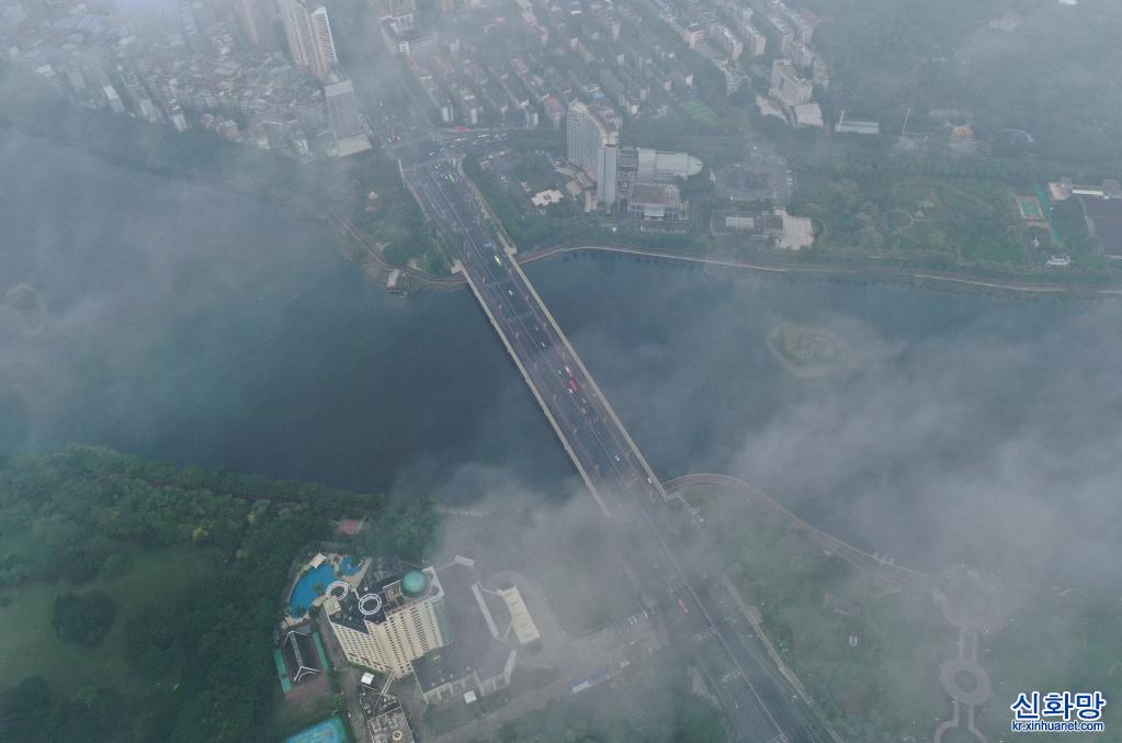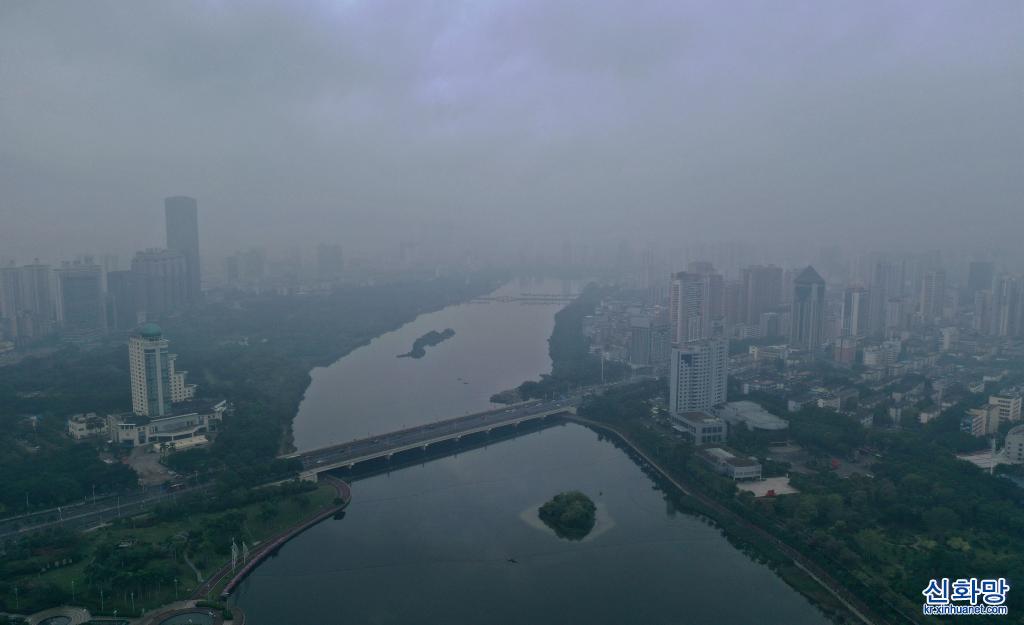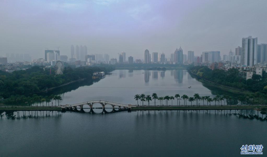 광시좡족자치구 난닝(南寧)시 난후(南湖)에 안개비가 자욱하다.(11월21일 촬영, 드론 사진) 광시좡족자치구 난닝시에 연일 안개비가 내렸다. 안개비 속 ‘녹색 도시’ 경관이 색다른 운치를 자아낸다.[촬영/신화사 기자 황샤오방(黃孝邦)]