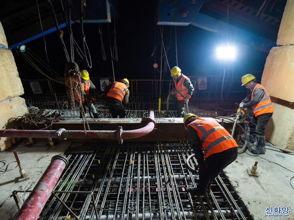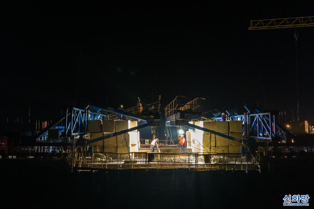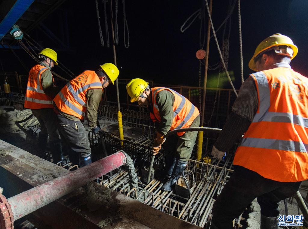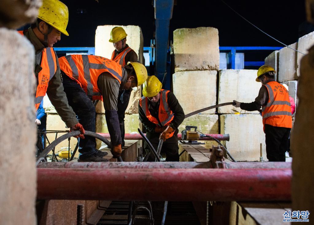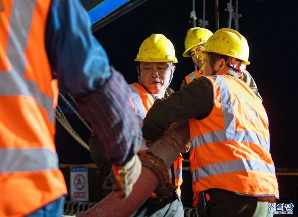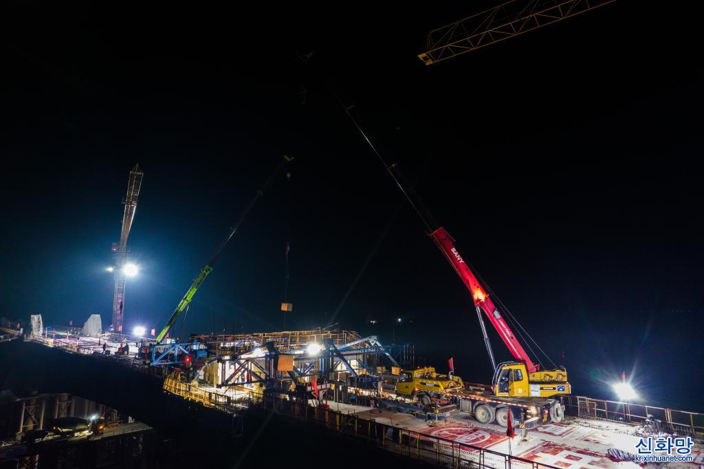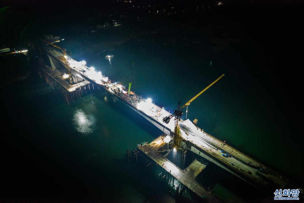 27일 새벽 창더~이양~창사 고속철 쯔수이강 대교 위에서 근로자들이 접합 작업을 하고 있다.(드론 사진)