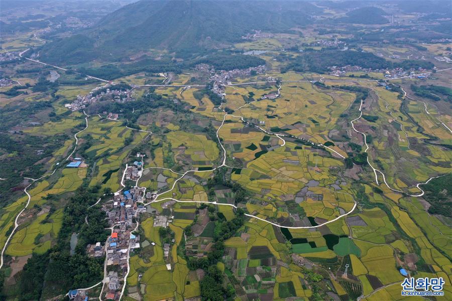 광시좡족자치구 룽안현은 탄터우향 신구이촌의 마을 도로(드론 사진, 10월23일 촬영)