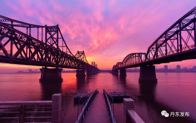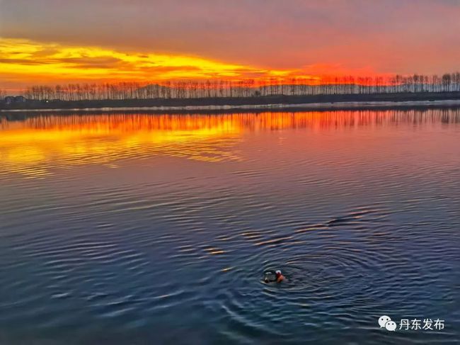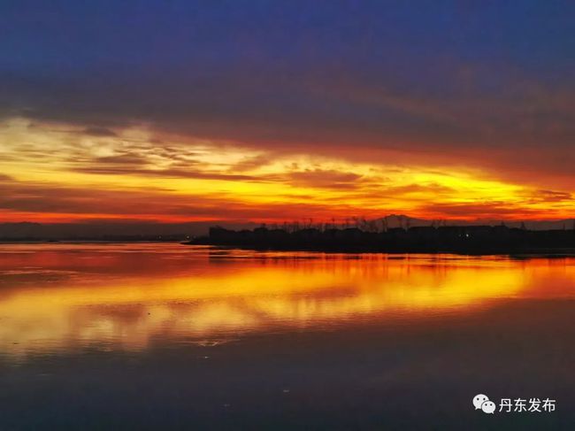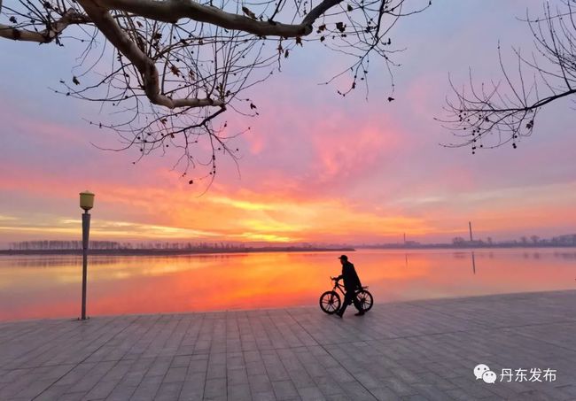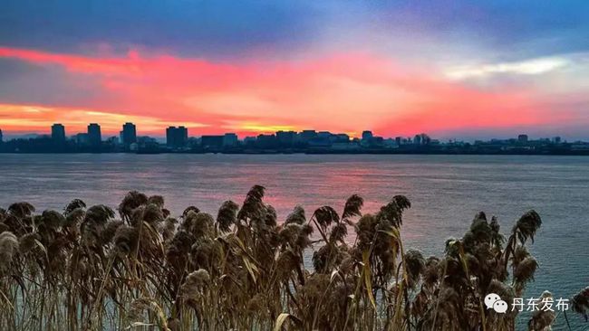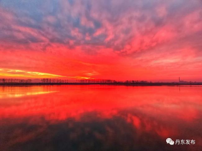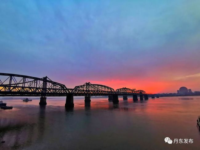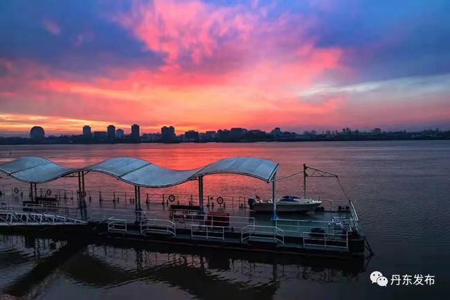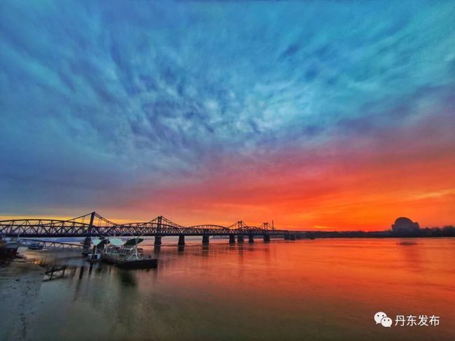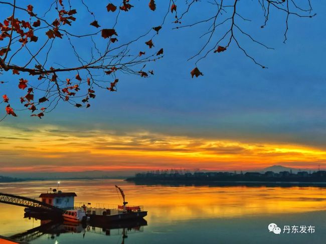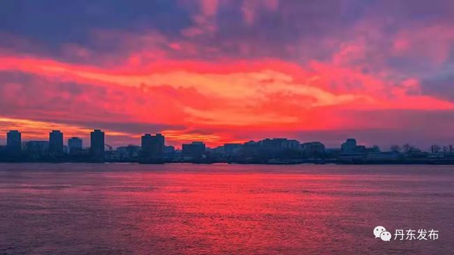 12월 9일 이른 아침, 아름다운 아침노을이 압록강 상공을 덮으면서 강수면을 붉게 물들이고 있다. 편역:추윤