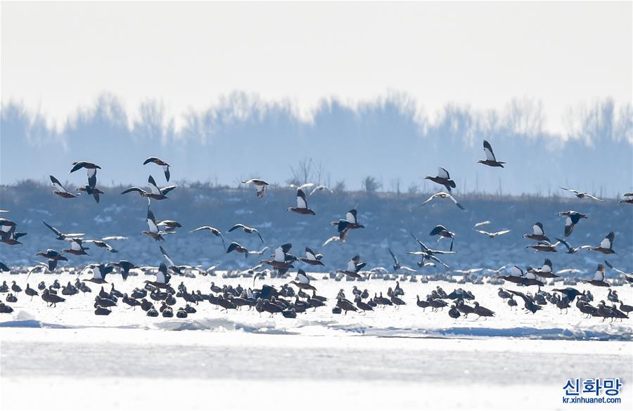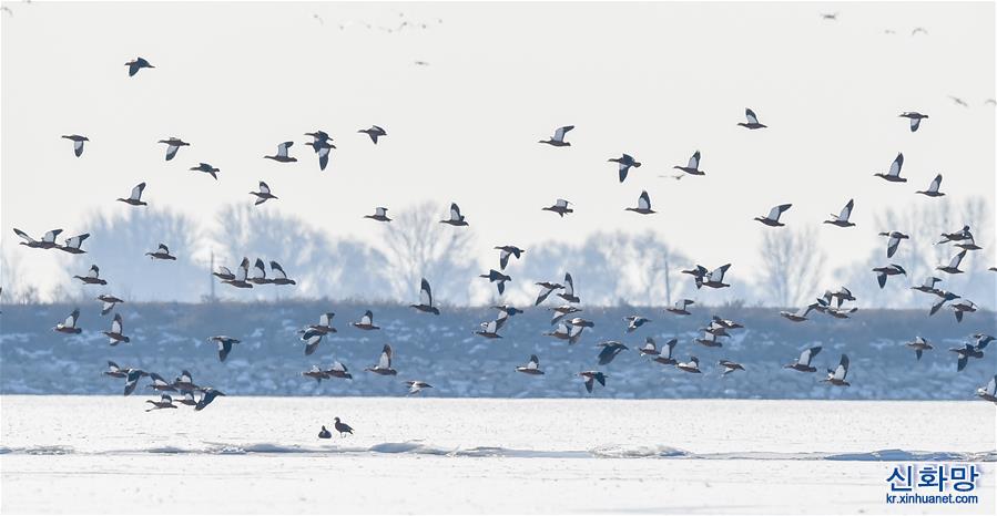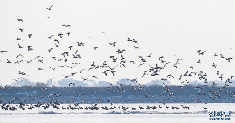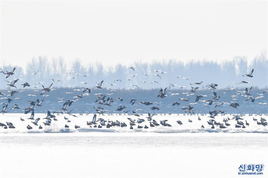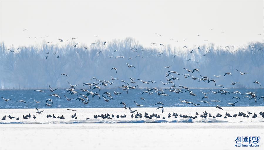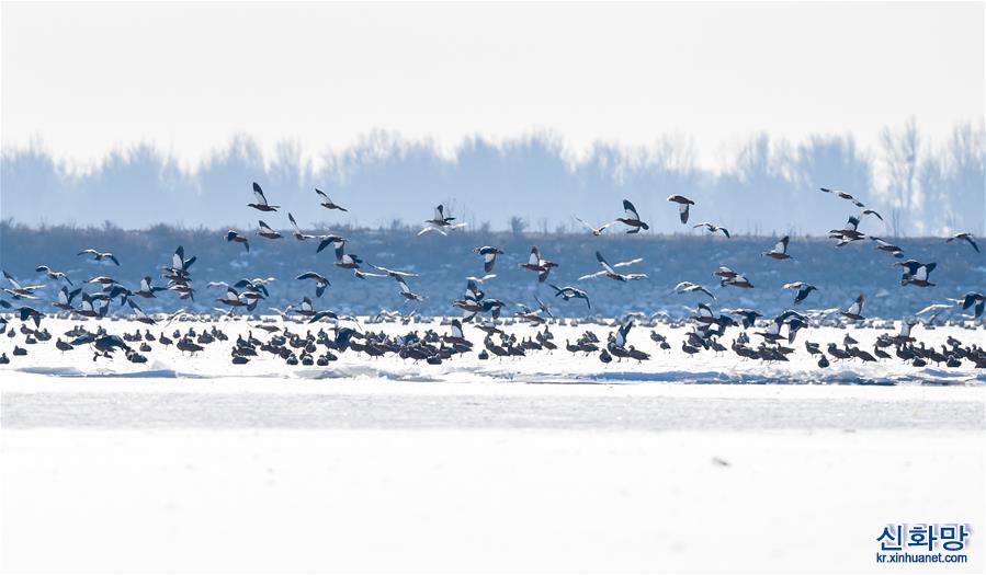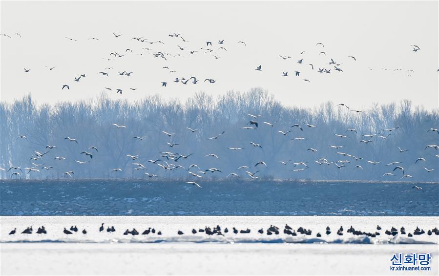 후허하오터 투모터좌기 하이류 저수지에서는 4~5천 마리의 황오리들이 무리 지어 생활하고 있다. 겨울 철새들의 방문으로 하이류 저수지는 생기가 넘치고 있다.[촬영/신화사 기자 펑위안(彭源)]