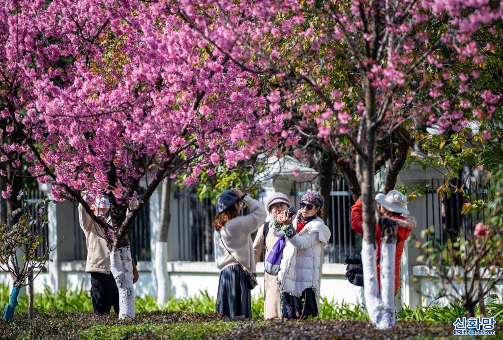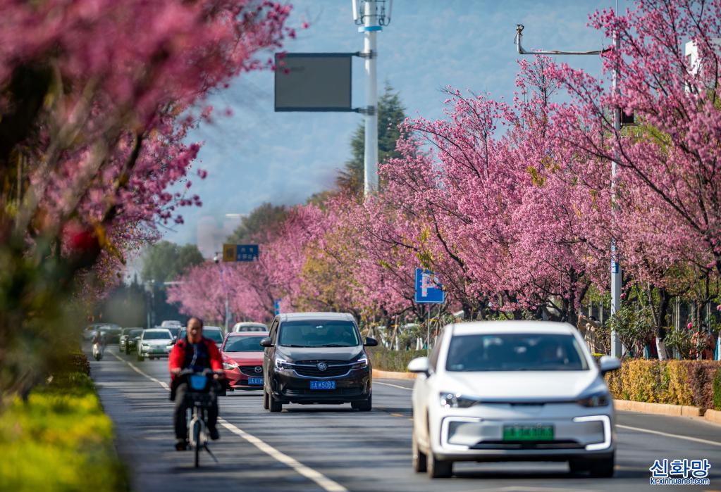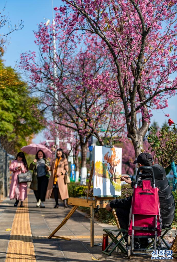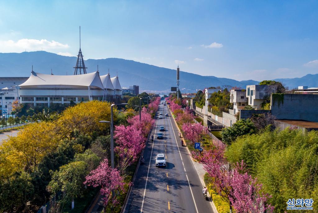 21일 윈난성 쿤밍시는 햇살이 따사롭고 포근한 날씨를 보였다. 맑고 푸른 하늘 아래 쿤밍시 일부 도로변에 심은 겨울벗꽃이 만개해 한 폭의 그림 같은 풍경을 연출했다.[촬영/신화사 기자 천신보(陳欣波)]