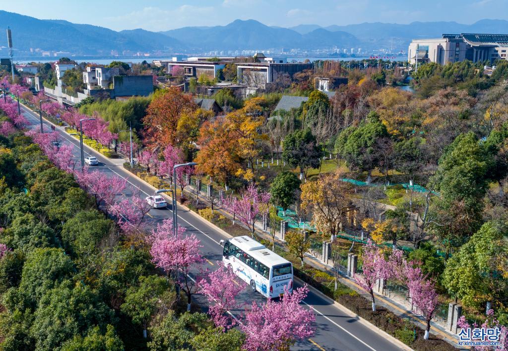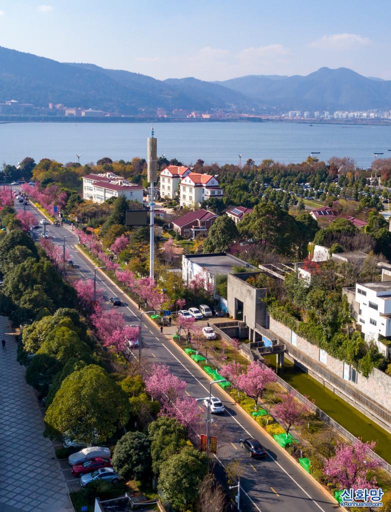 쿤밍시 도로변에 활짝 핀 겨울벗꽃(12월21일 드론 촬영)
