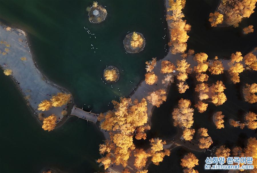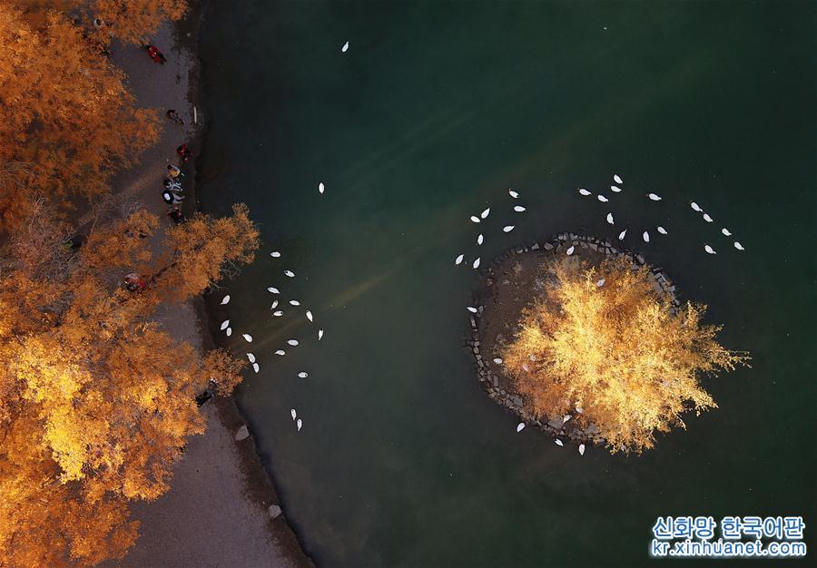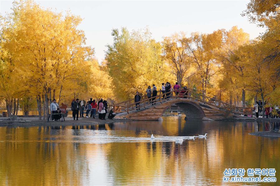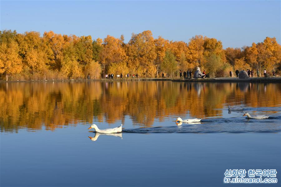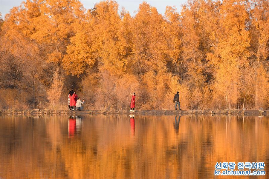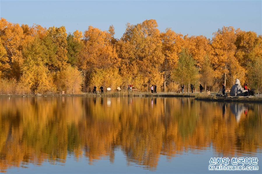 10월21일, 여행객이 진타(金塔) 사막 후양림 관광지를 구경하고 있다. 완연한 가을, 간쑤성 주취안(酒泉)시 진타현에 있는 진타 사막 후양림 관광지에 금빛 물결이 일렁이고 있다. 호수의 푸른 물에 비친 금빛 후양림이 색다른 풍경을 연출한다. [촬영/신화사 기자 마닝(馬寧)]