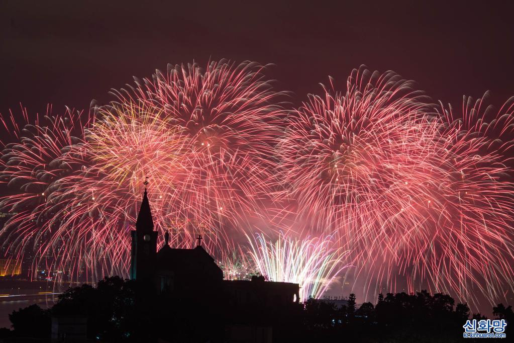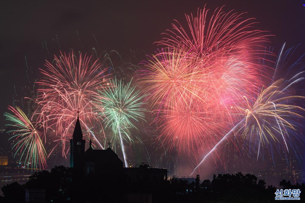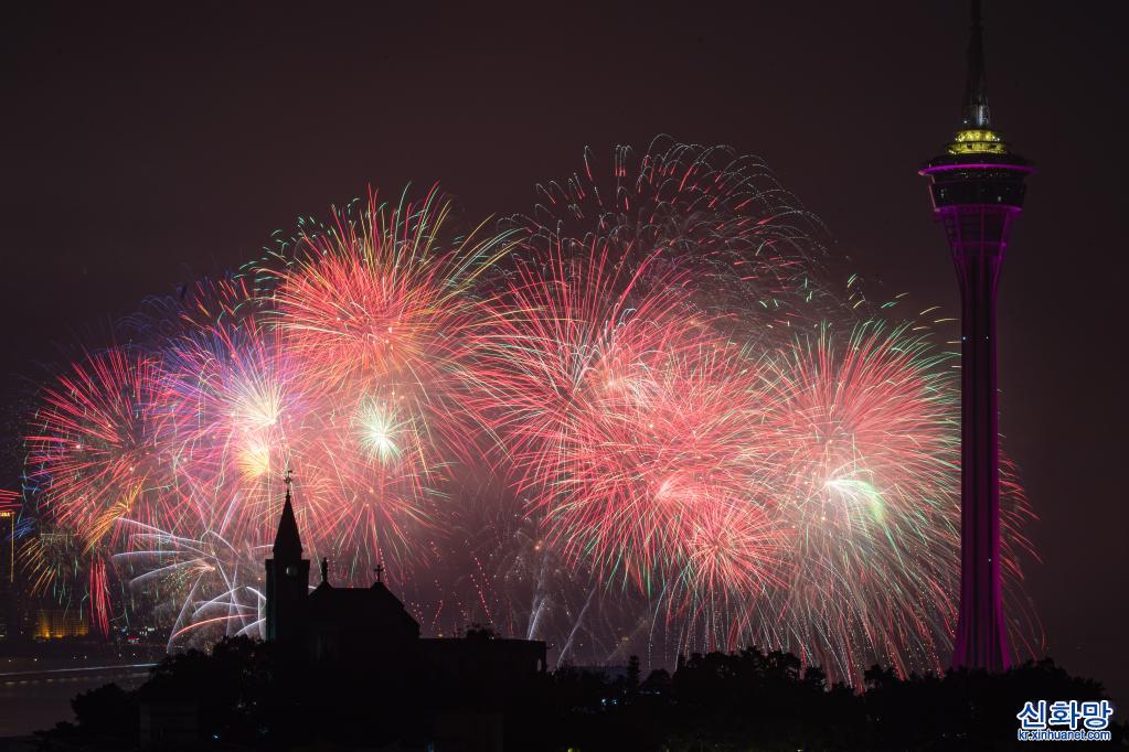 마카오 관광국이 7일 저녁 개최한 새해 불꽃놀이 공연에서 오색찬란한 불꽃이 밤하늘을 수놓고 있다. [촬영/신화사 기자 장진자(張金加)]