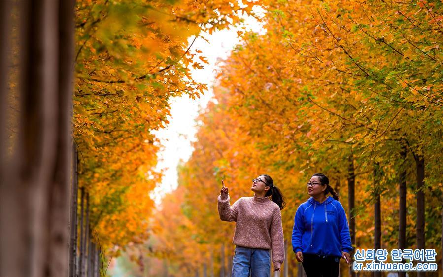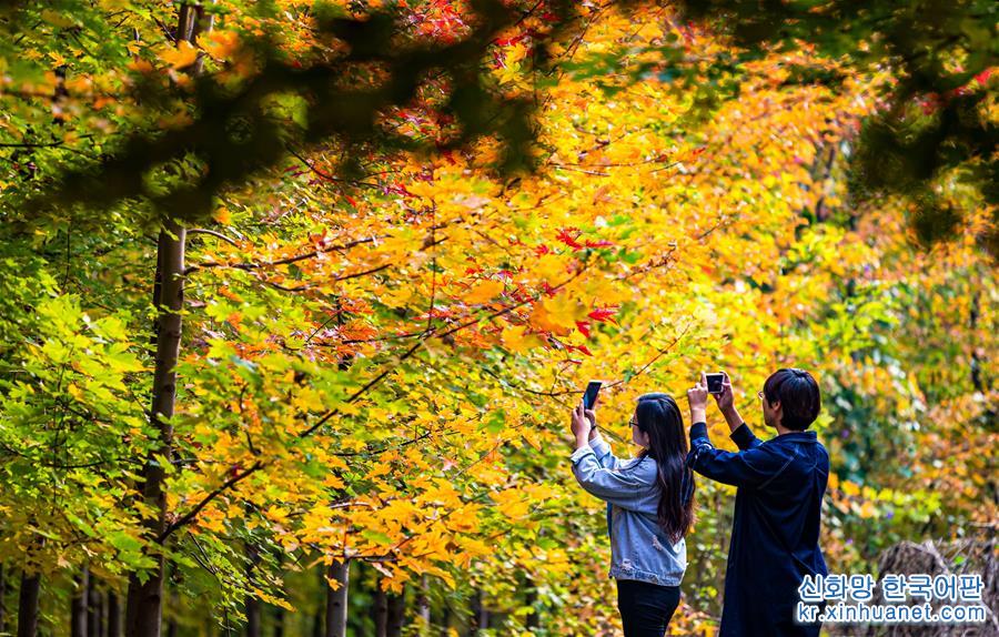 단풍이 무르익는 가을, 허베이 한단(邯鄲)시 펑펑쾅(峰峰礦)구 이징(義井)진 타이항 야오왕곡 관광지는 붉게 물든 단풍으로 매혹적인 풍경을 연출하고 있다. [촬영/신화사 기자 왕샤오(王曉)]