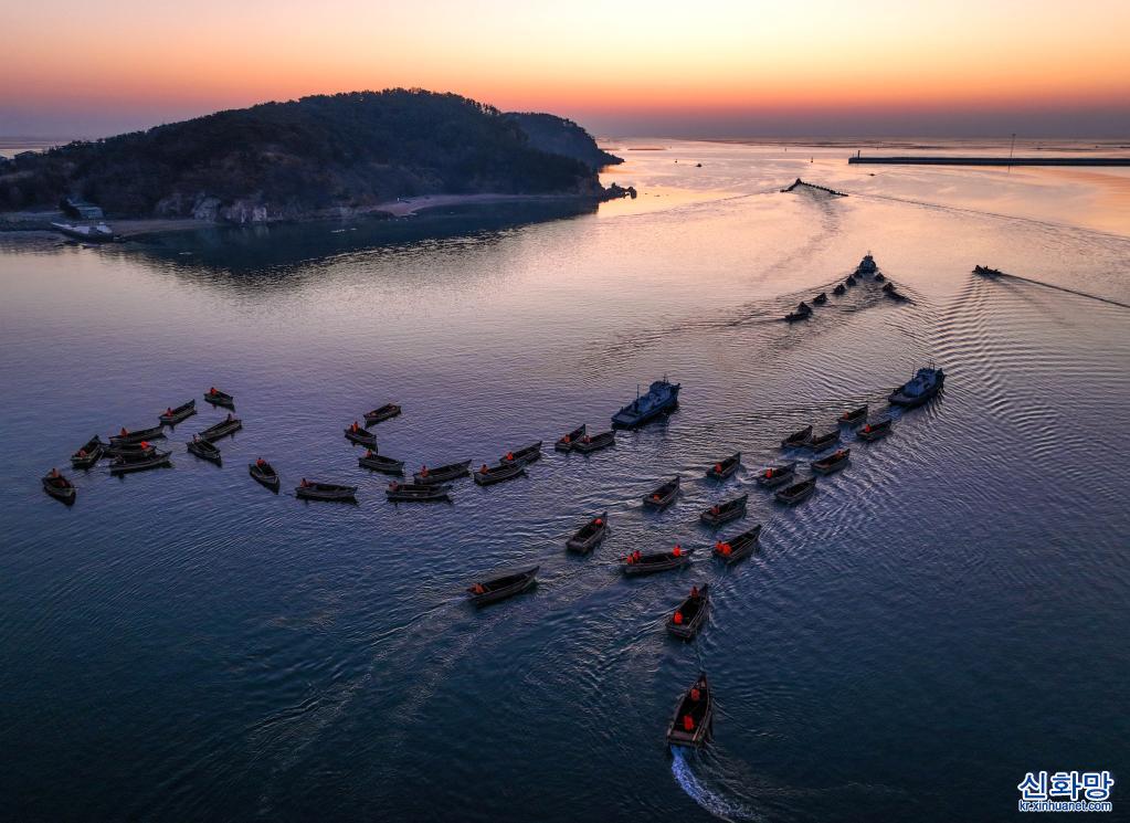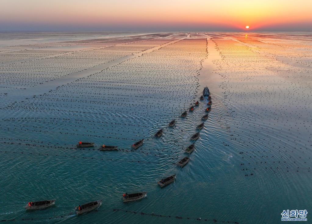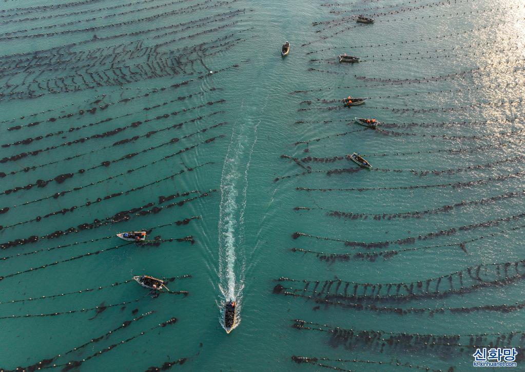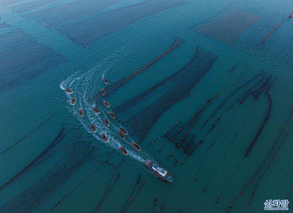 2월24일 산둥(山東)성 룽청(榮成)시 쉰산(尋山)가도 아이룬(愛倫)만 해역에서 해상 작업 중인 어민들의 모습. 봄철 바다 생산이 집중되는 시기가 다가왔다. 어민들이 산둥성 룽청시에서어선과 삼판보트를 타고 바다 위를 오가며 해조류 관리와 양식용 부표 교체 등 각종 양식 작업에 한창이다. 마치 ‘바다 위의 봄갈이’를 하는 것처럼 분주한 모습이다. [촬영/신화사 기자 리신쥔(李信君)]