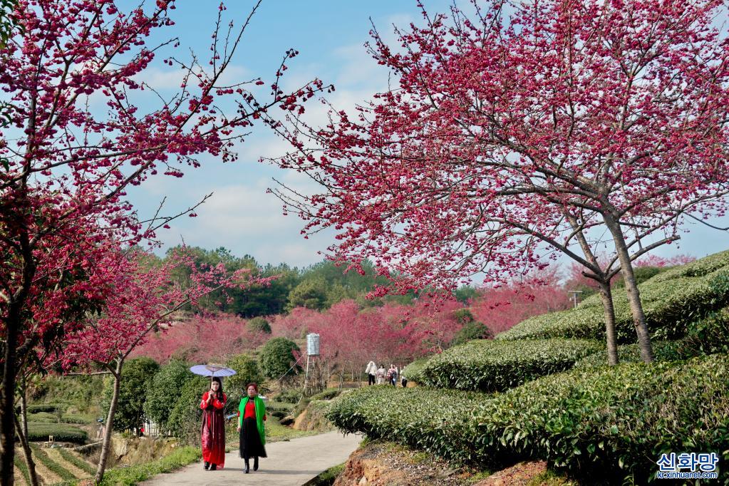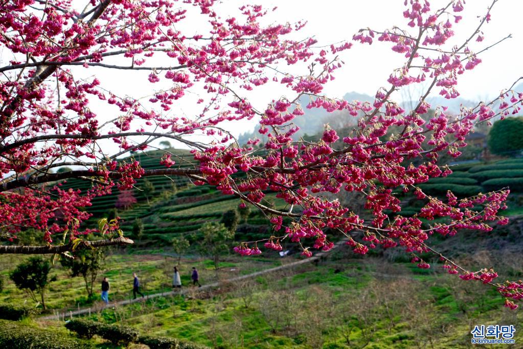 푸젠성 우이산에 있는 한 차밭에 찻잎이 파릇파릇 돋아나고 벗꽃이 만개하면서 이른 봄 경치를 감상하려는 상춘객들의 발길이 이어지고 있다.[촬영/신화사 기자 천잉(陳穎)]