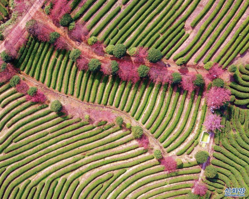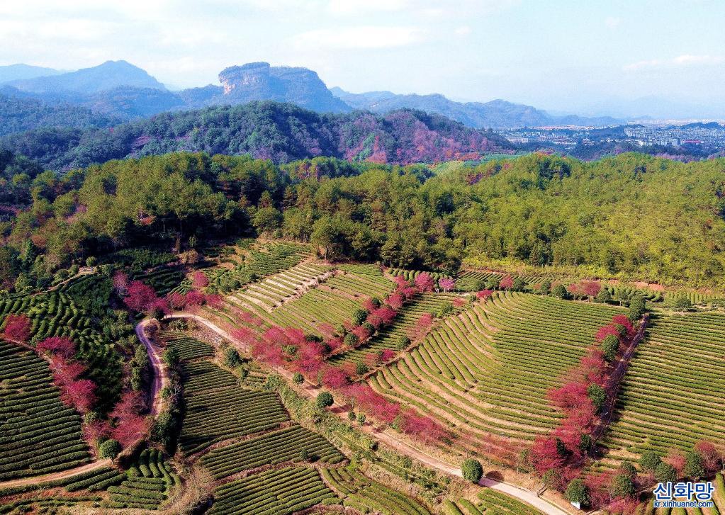 푸젠성 우이산의 차밭에 벚꽃이 만개했다.(드론 사진, 2월25일 촬영)