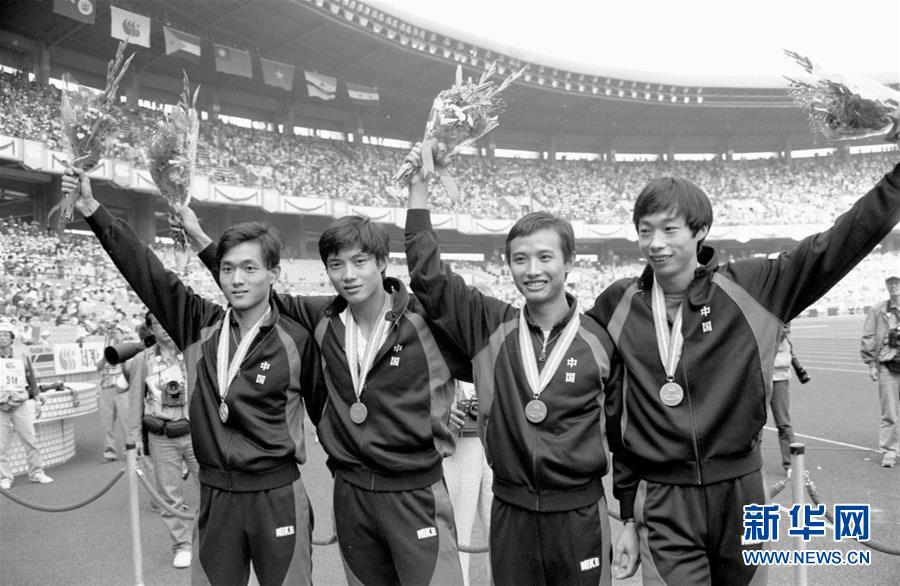 1986년 10월 5일 차이젠밍(蔡建明), 리펑(李豐), 위좡후이(餘壯輝), 정천(鄭晨)으로 구성된 중국 대표팀이 제10회 아시안게임 남자 4×100m 계주 결승에서 39초 17로 아시아 기록을 경신하고 중국 대표팀에 94번째 금메달을 안겼다. 중국 대표단은 육상 종목에서 가장 많은 수의 금메달을 땄다. [사진 출처: 신화망]