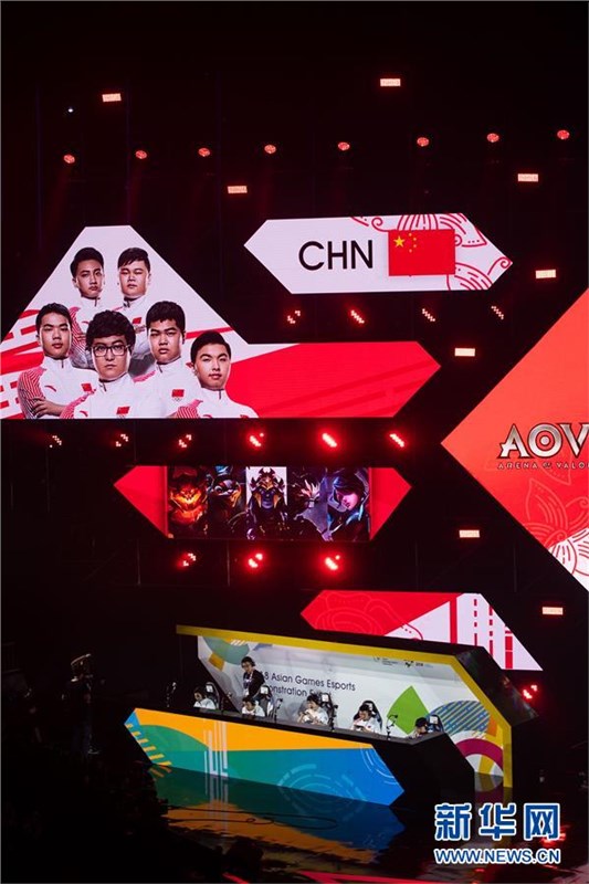 2018년 8월 26일 인도네시아 자카르타에서 열린 제18회 아시안게임 e-스포츠 종목 ‘아레나 오브 발러(AOV, 한국명 펜타스톰)’에서 중국팀이 경기를 하고 있다. 중국팀은 e-스포츠 종목에서 금메달을 목에 걸었다. [사진 출처: 신화망]