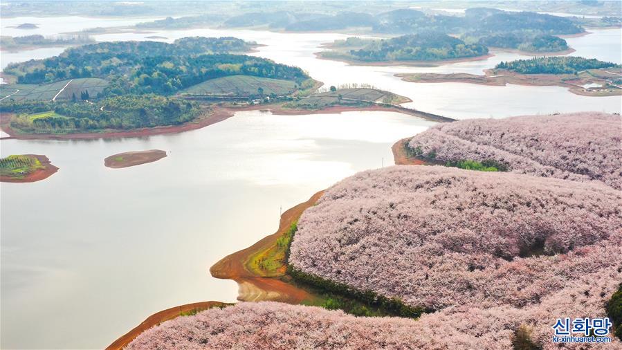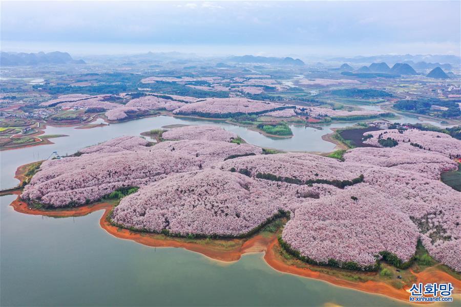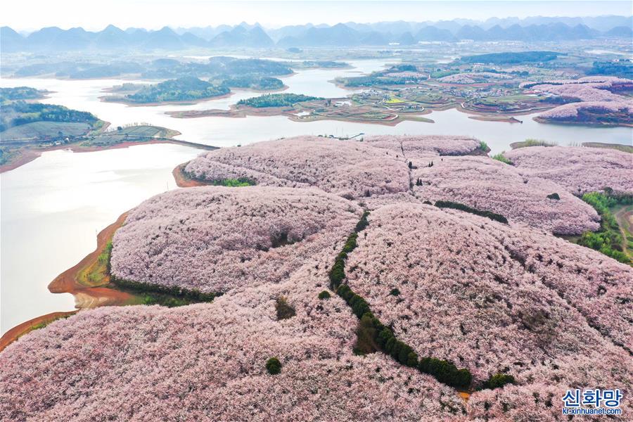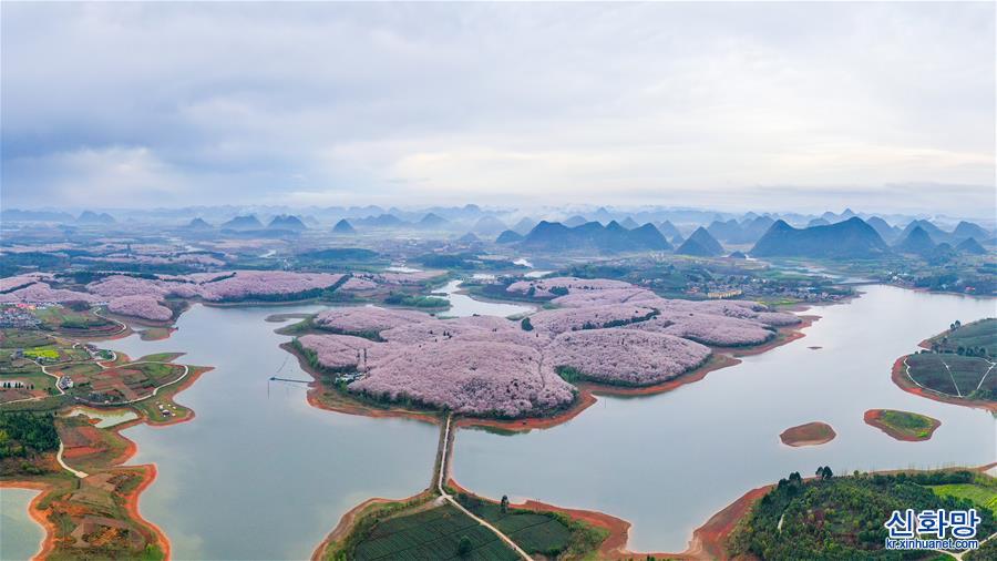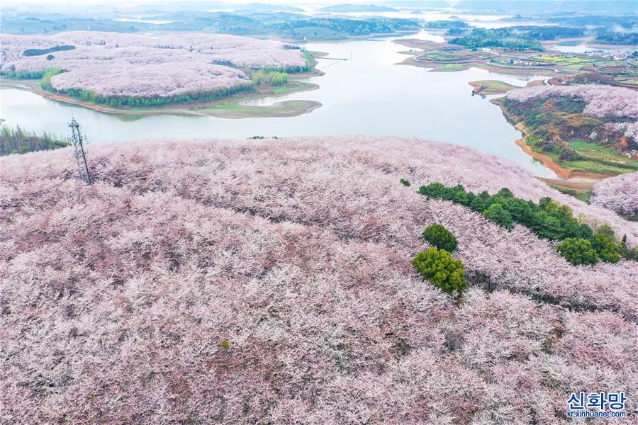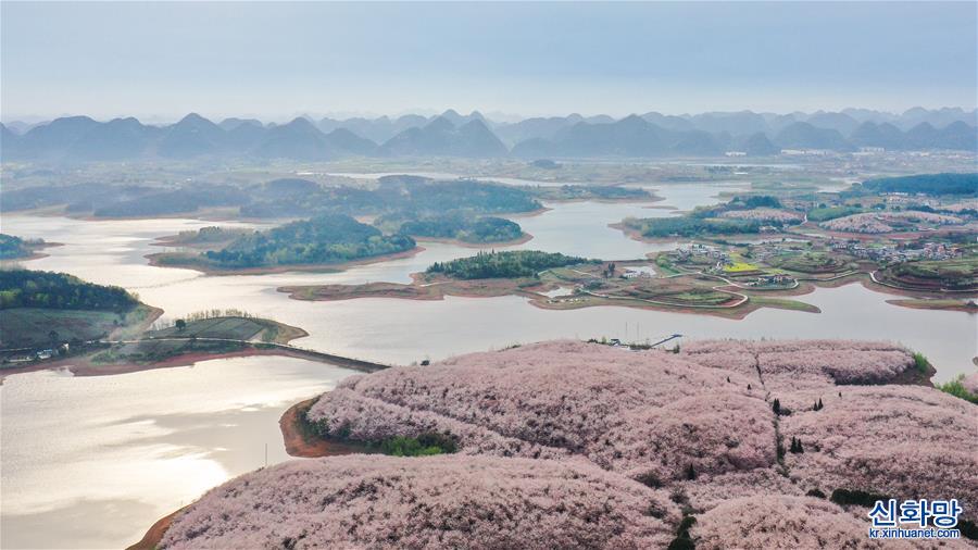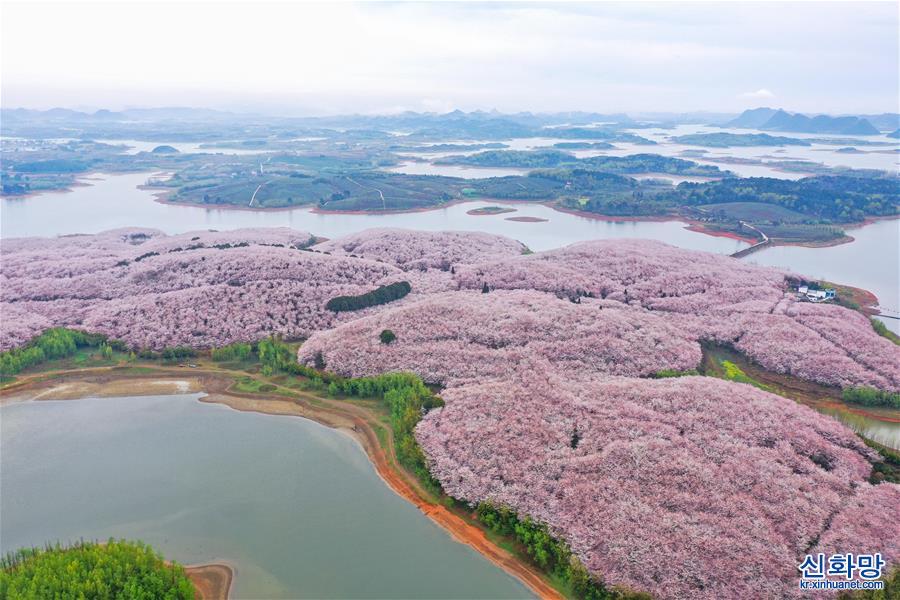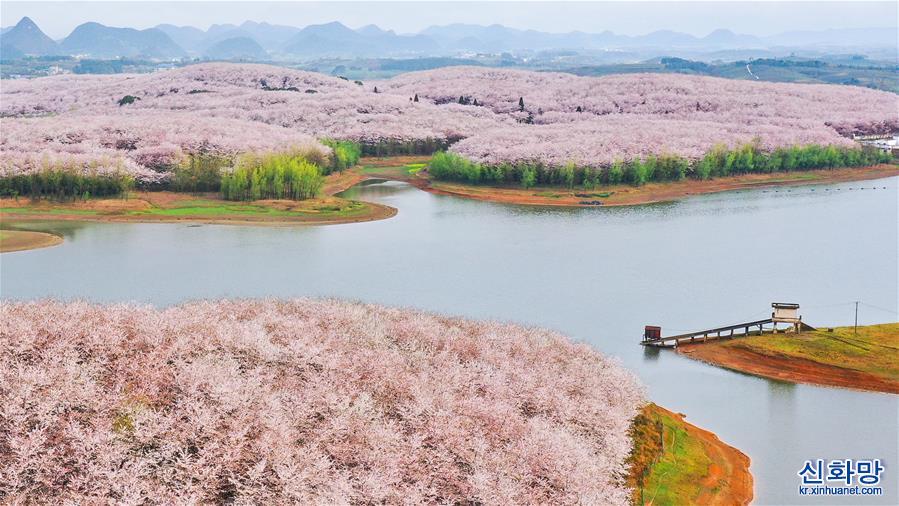 구이안 신구(貴安新區)에 벚꽃이 활짝 폈다. (드론 사진) 구이저우(貴州)성 구이안신구 벚꽃단지 안에 봄을 알리는 벚꽃이 만개하면서 상춘객들의 발길이 이어지고 있다. 구이안신구 벚꽃단지 안에는 70만 그루의 벚나무가 있다.[촬영/신화사 기자 어우둥취(歐東衢)]