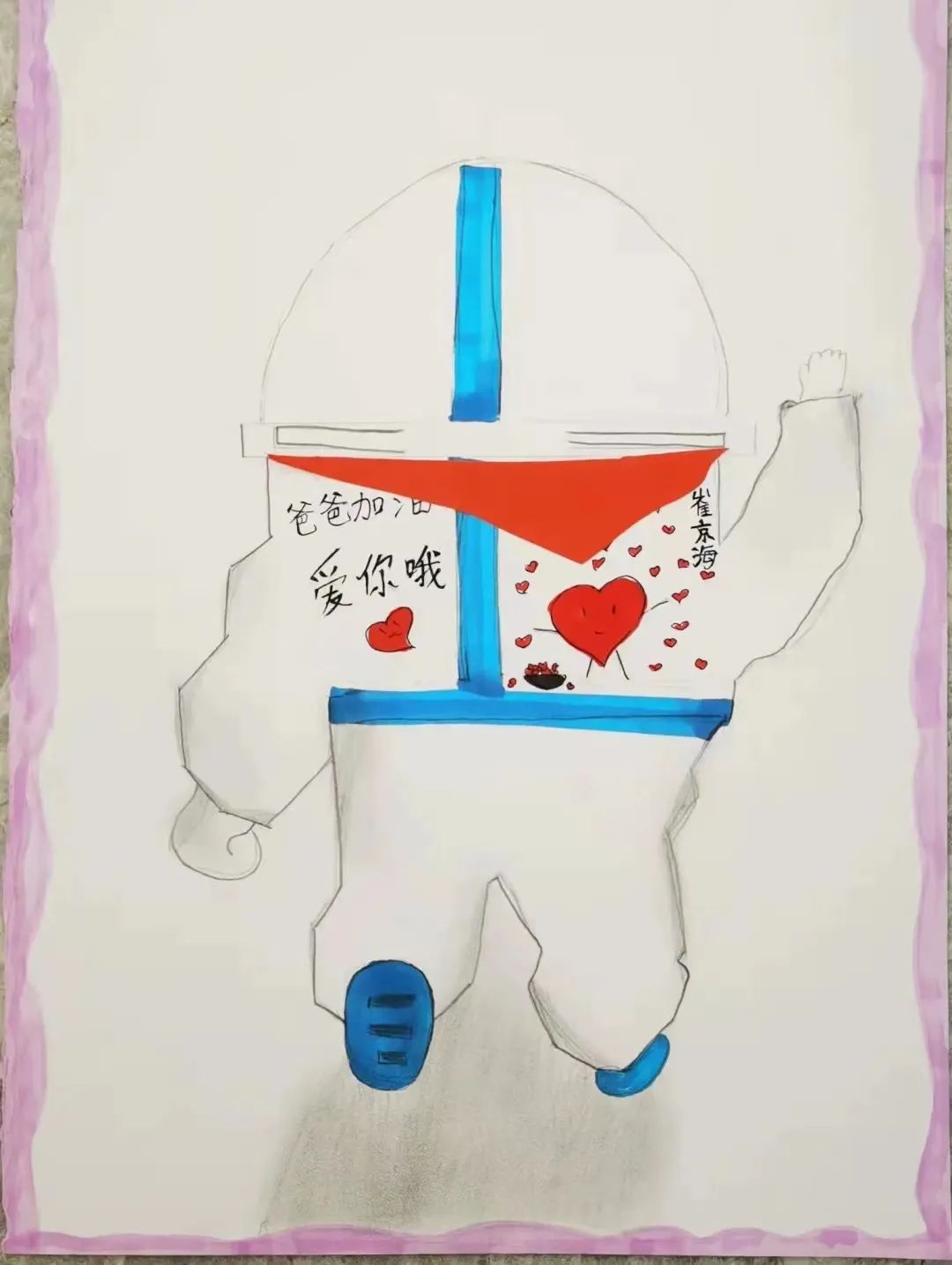 그들은 단지내 방역일군들의 이름을 기억하고 그들의 모습을 그대로 본따서 회화작품을 제작했다. 가슴 우에 새겨진 이름, 목에 걸린 붉은 넥타이 그리고 방호복을 빼곡히 채운 응원글귀까지… 소선대원들은 저마다의 개성을 살린 회화작품으로 방역일군에 대한 진심어린 경의와 감사를 표했다.