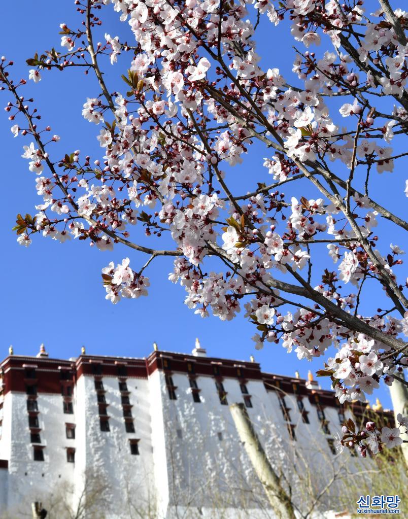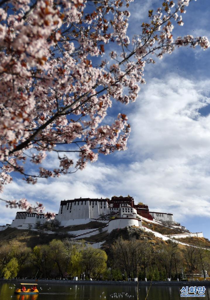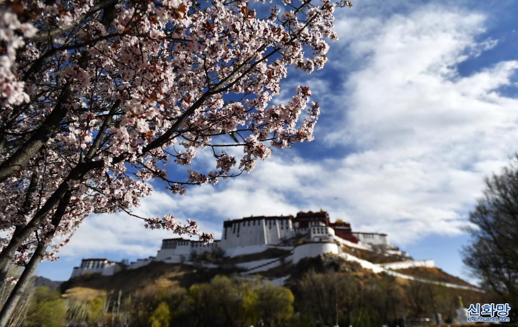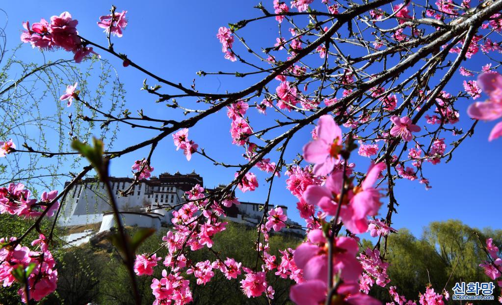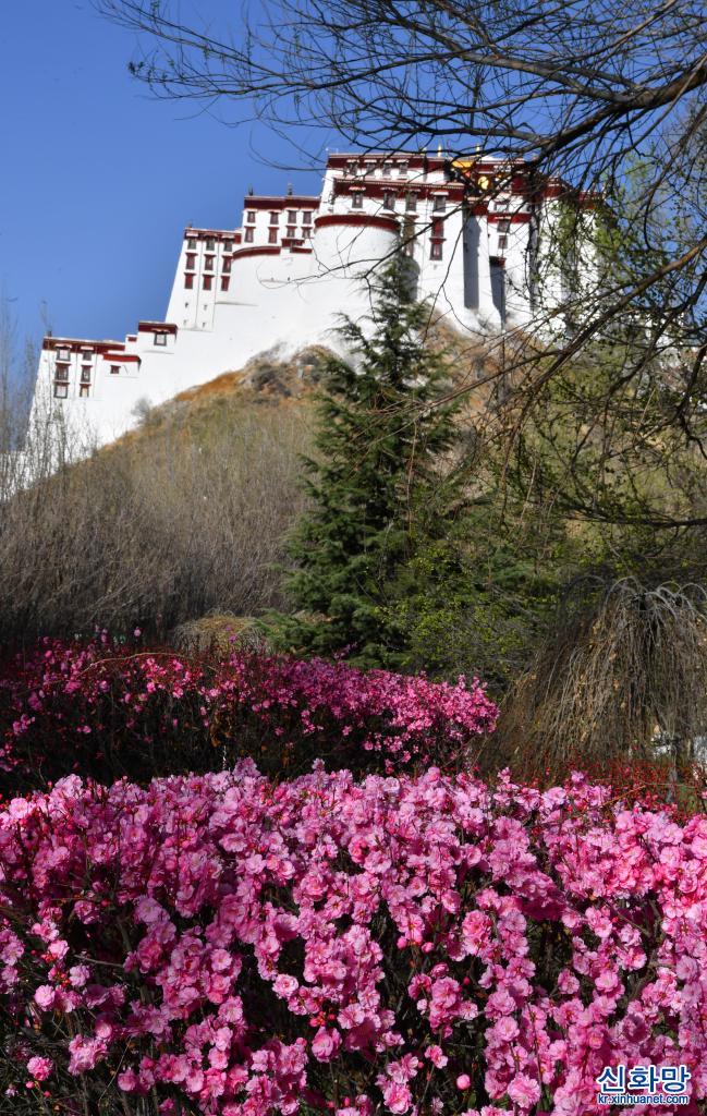 부다라궁 앞에 활짝 핀 꽃들이 봄소식을 알리고 있다.2022.3.31 올해 3월은 예년보다 기온이 높아 개화 시기도 빨라졌다. 부다라궁(포탈라궁) 주위에 활짝 핀 꽃들이 완연한 봄기운을 전하고 있다.[촬영/신화사 기자 줴궈(覺果)]