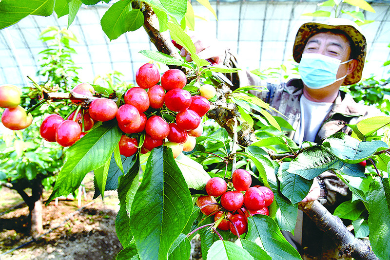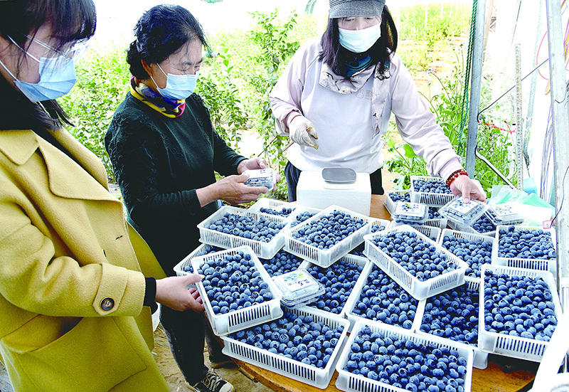 4월 7일, 진안구 탕산성진(汤山城镇) 목윤과채합작사(木润果蔬合作社) 사원 양수걸(杨秀杰)은 집 하우스에 3000여 그루의 블루베리가 익으면서 고용인을 데리고 블루베리를 따고 포장하느라 여념이 없었다.