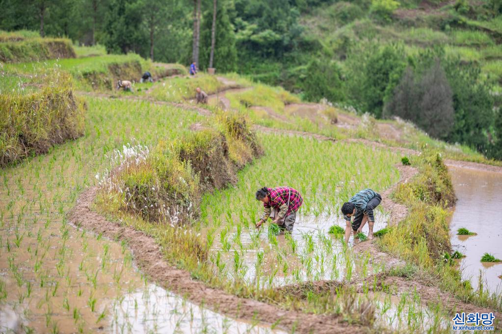29일 드론으로 촬영한 충칭시 펑두현 리쯔향의 다락논(드론 사진) 충칭(重慶)시 펑두(豐都)현 리쯔(栗子)향 농민들은 바쁜 초여름 농사철을 맞아 모심기에 온 힘을 쏟아 붓고 있다.