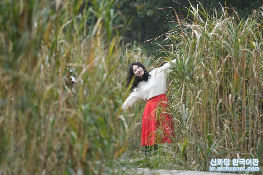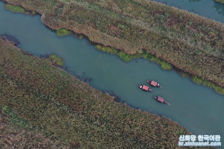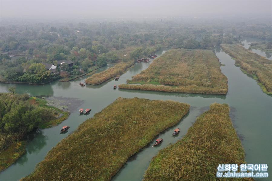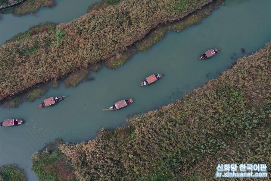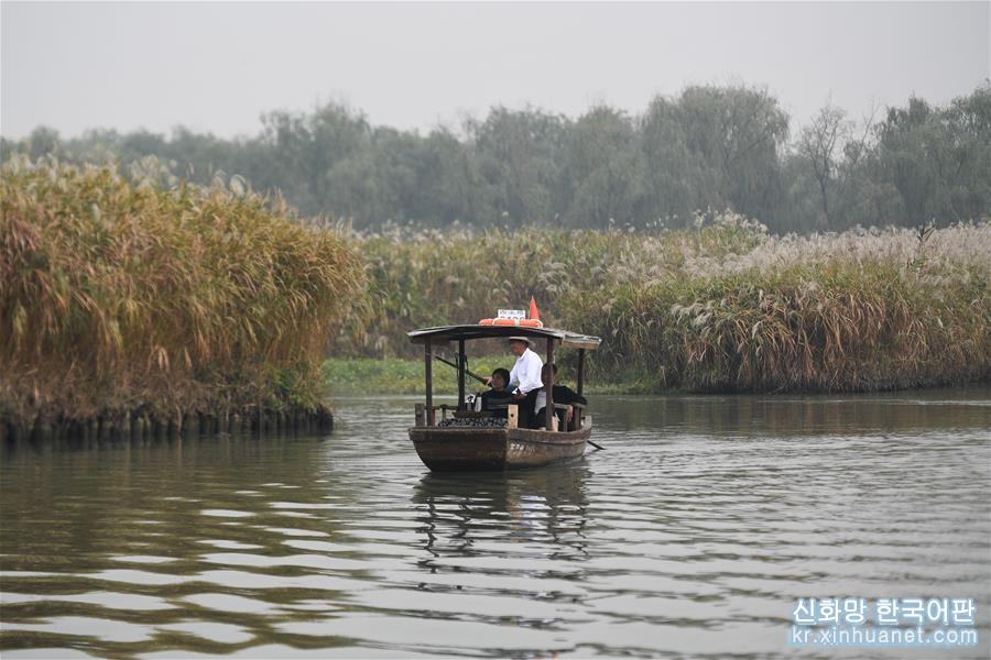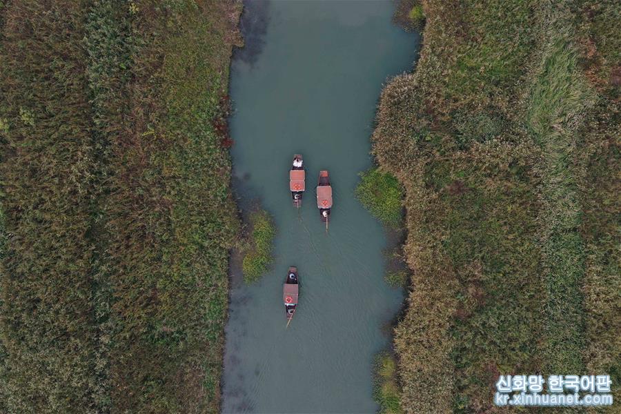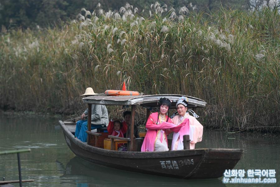11월3일, 시시(西溪) 습지에서 여행객들이 배에서 저장성 지방극인 월극(越劇) 음송(吟誦)을 감상하면서 갈대꽃을 구경하고 있다. 깊어 가는 가을, 저장 항저우 시시습지 국가공원의 갈대가 절정을 이루고 있다. [촬영/신화사 기자 황쭝즈(黃宗治)]