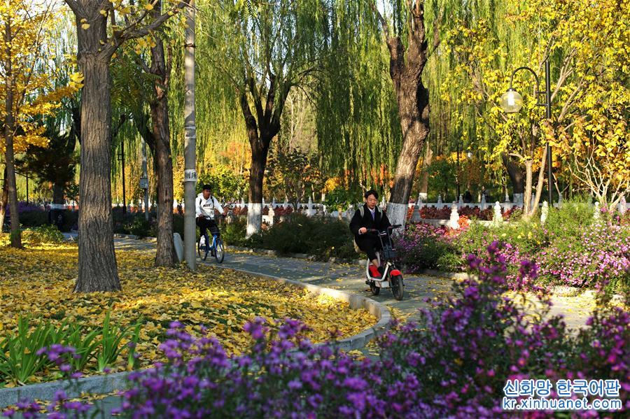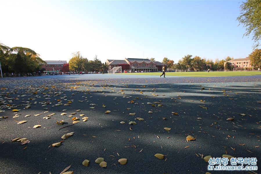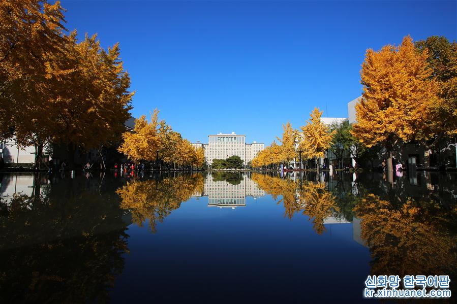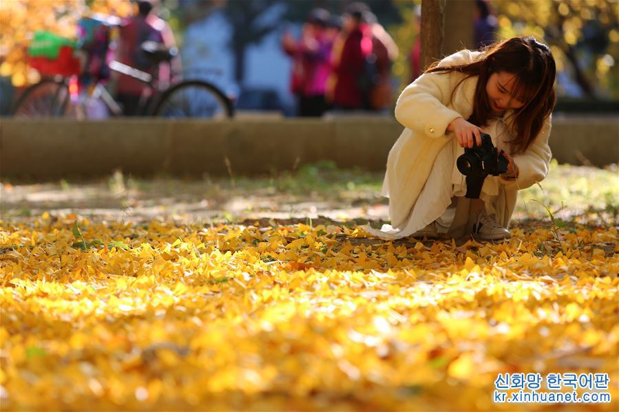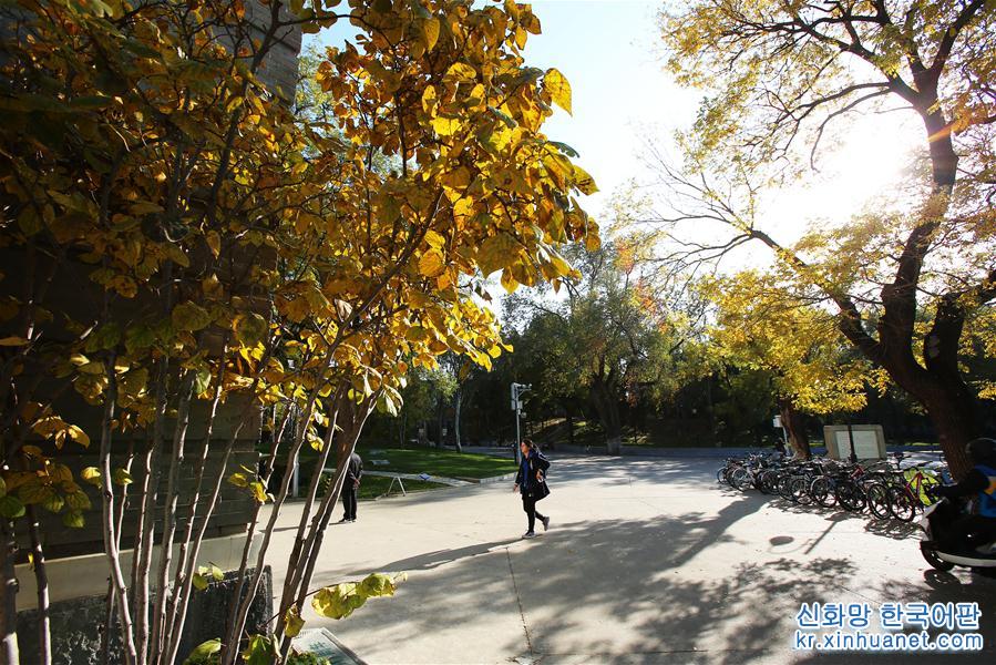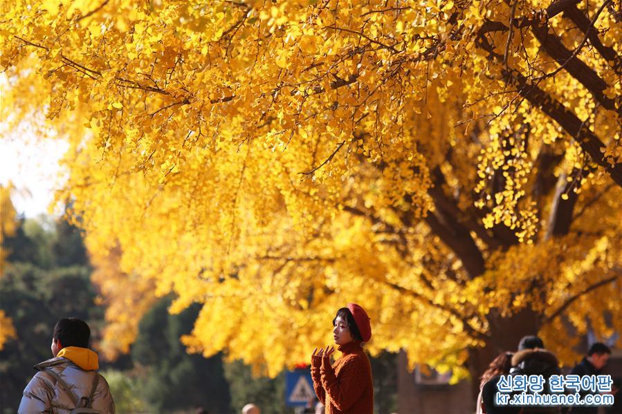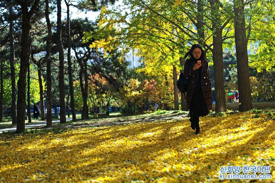 11월 7일, 한 여대생이 칭화(清華)대학교 칭화로(清華路)에서 사진을 찍고 있다. 한가을 오후, 칭화대학교 캠퍼스의 유화와 같은 알록달록한 경치가 사람들의 발길을 끌었다. [촬영/ 신화사 기자 리징(李京)]
