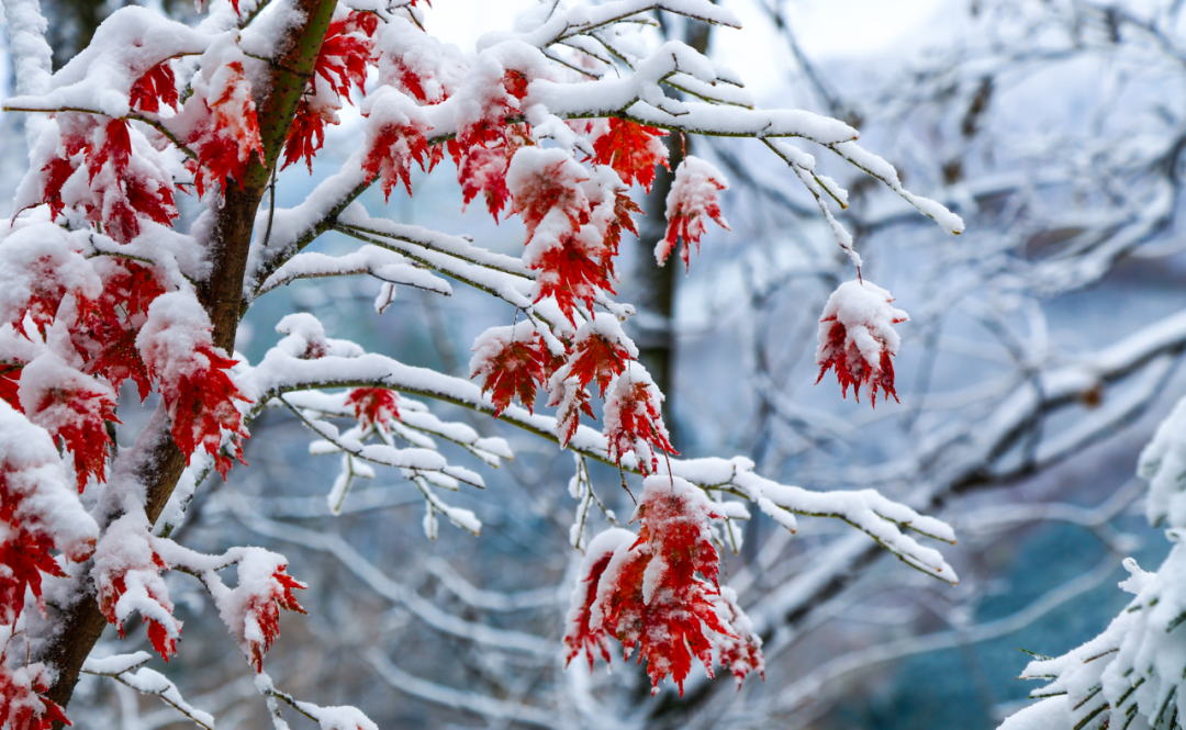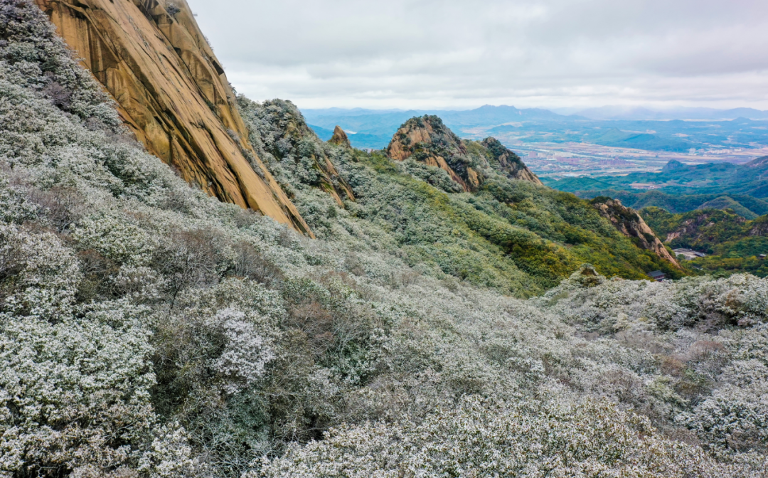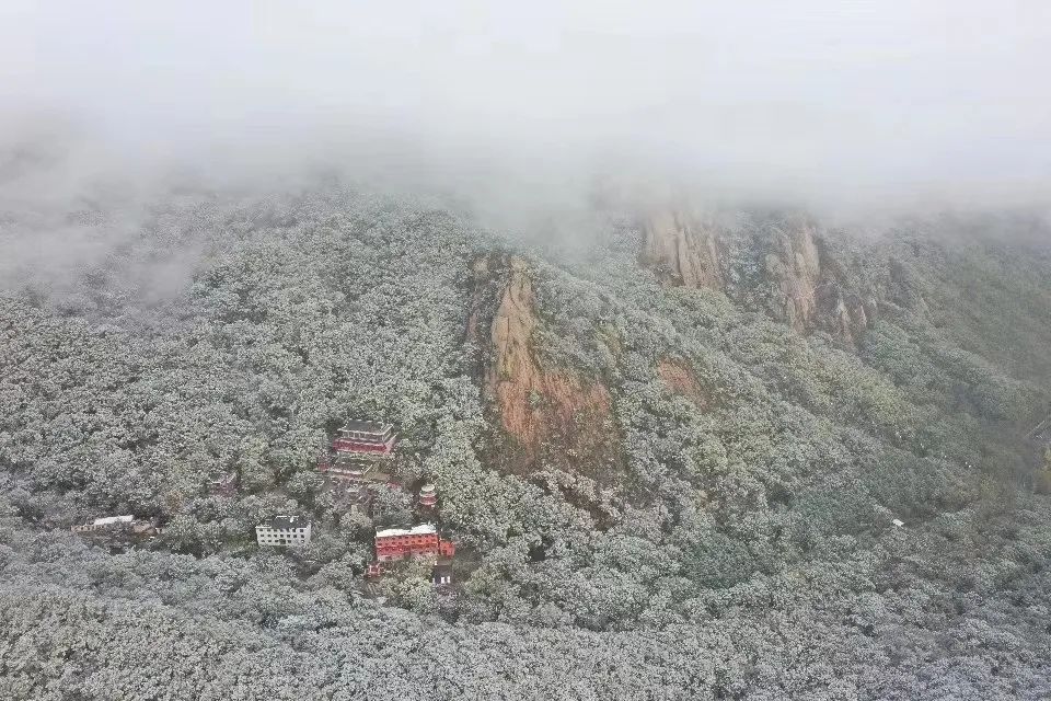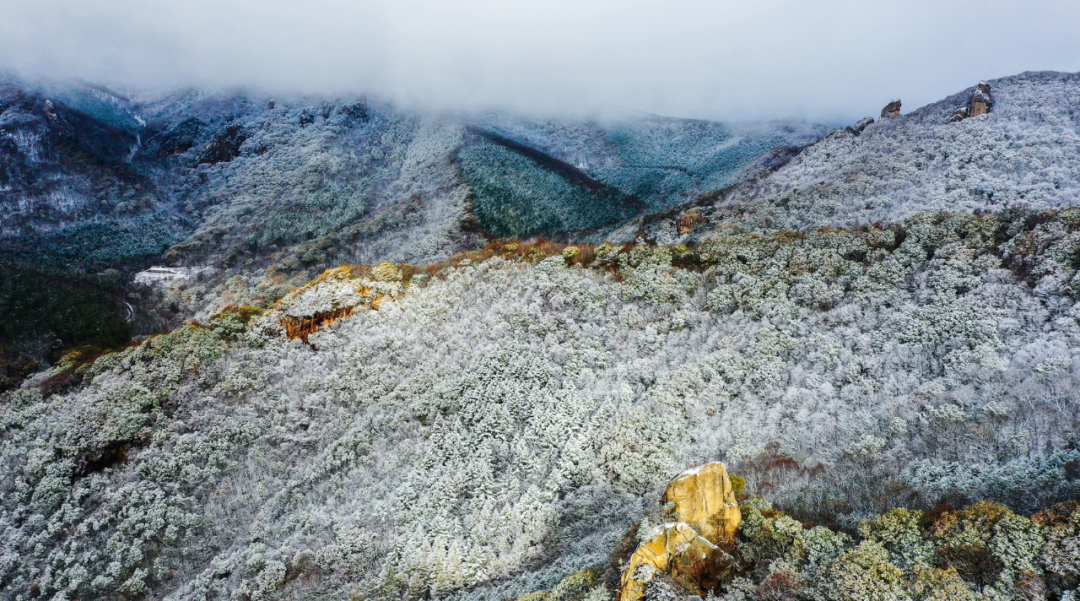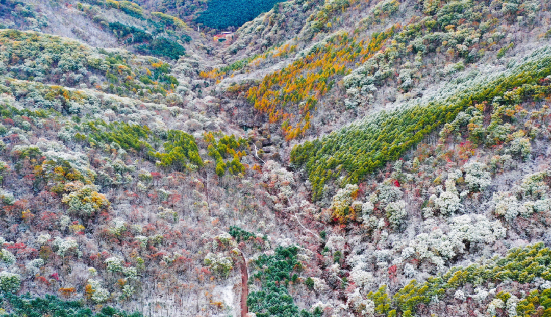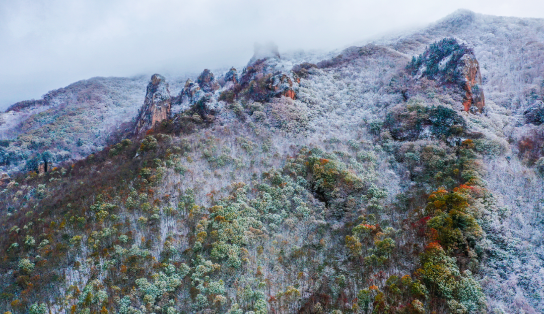산은 첫눈이 단풍과 만나 은빛단장을 하였다.