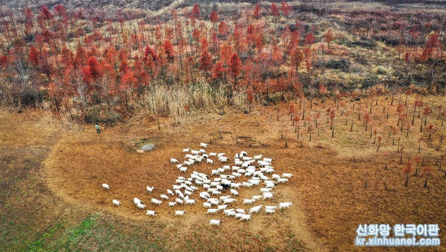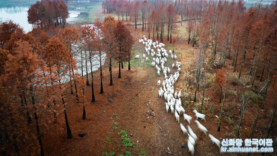 11월 27일, 방목을 마치고 쉐쿼이아 숲속에서 거닐고 있는 양떼(드론 촬영).