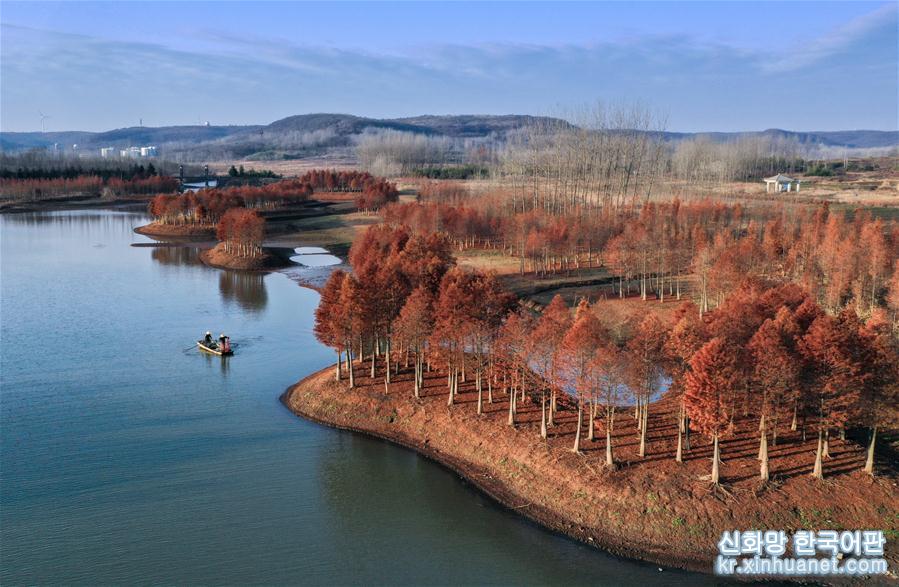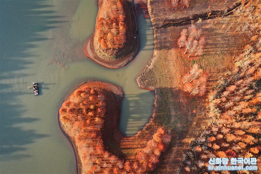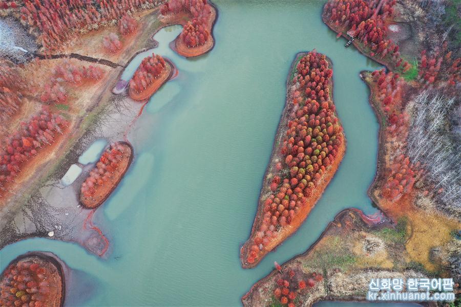 초겨울 시즌, 화려한 컬러로 단장된 장쑤(江蘇) 쉬이(盱眙) 톈취안호(天泉湖) 호숫가의 세쿼이아 숲이 독특한 풍경의 아름다움을 사람들 눈앞에 펼쳐주었다. 생태건설 과정에서 세쿼이아를 심은 톈취안호는 지금 유명한 생태관광 명소로 변신했다. [촬영/ 신화사 기자 양레이(楊磊)]