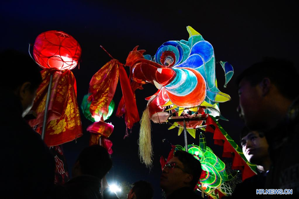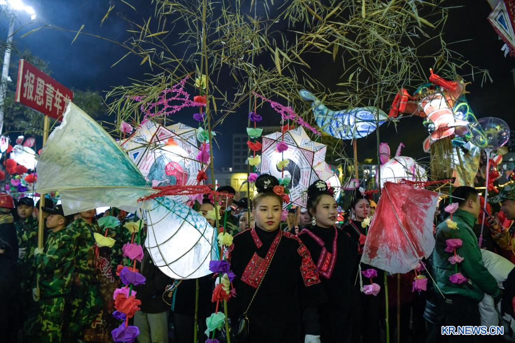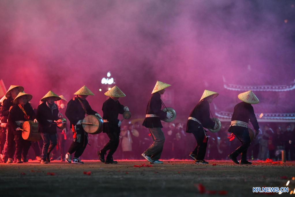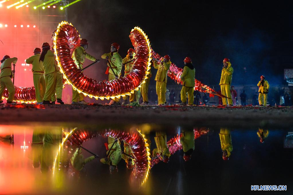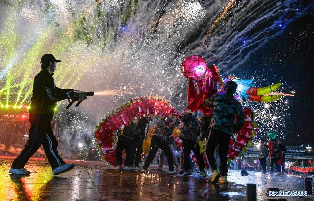 구이저우성 타이장현에서 원소절(元宵節∙정월 대보름)을 맞아 불꽃 용춤대회, ‘우룽쉬화(舞龍噓花)’가 열린 가운데 현 내 먀오족 마을에서 참가한 용춤팀들이 화려한 용춤을 선보이며 전통 명절을 즐겼다. 먀오족 전통 대보름맞이 행사인 ‘우롱쉬화’는 2021년 국가급 무형문화유산에 등재됐다. [촬영/양원빈(楊文斌)]
